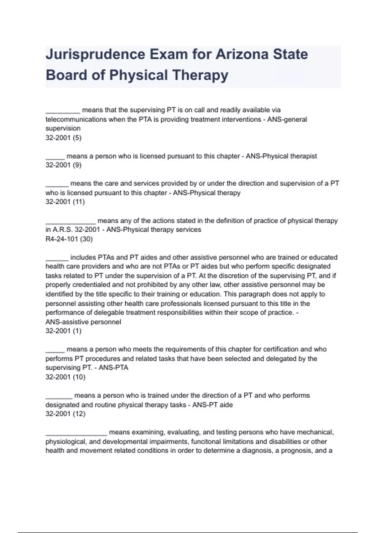 Jurisprudence Exam for Arizona State Board of Physical Therapy