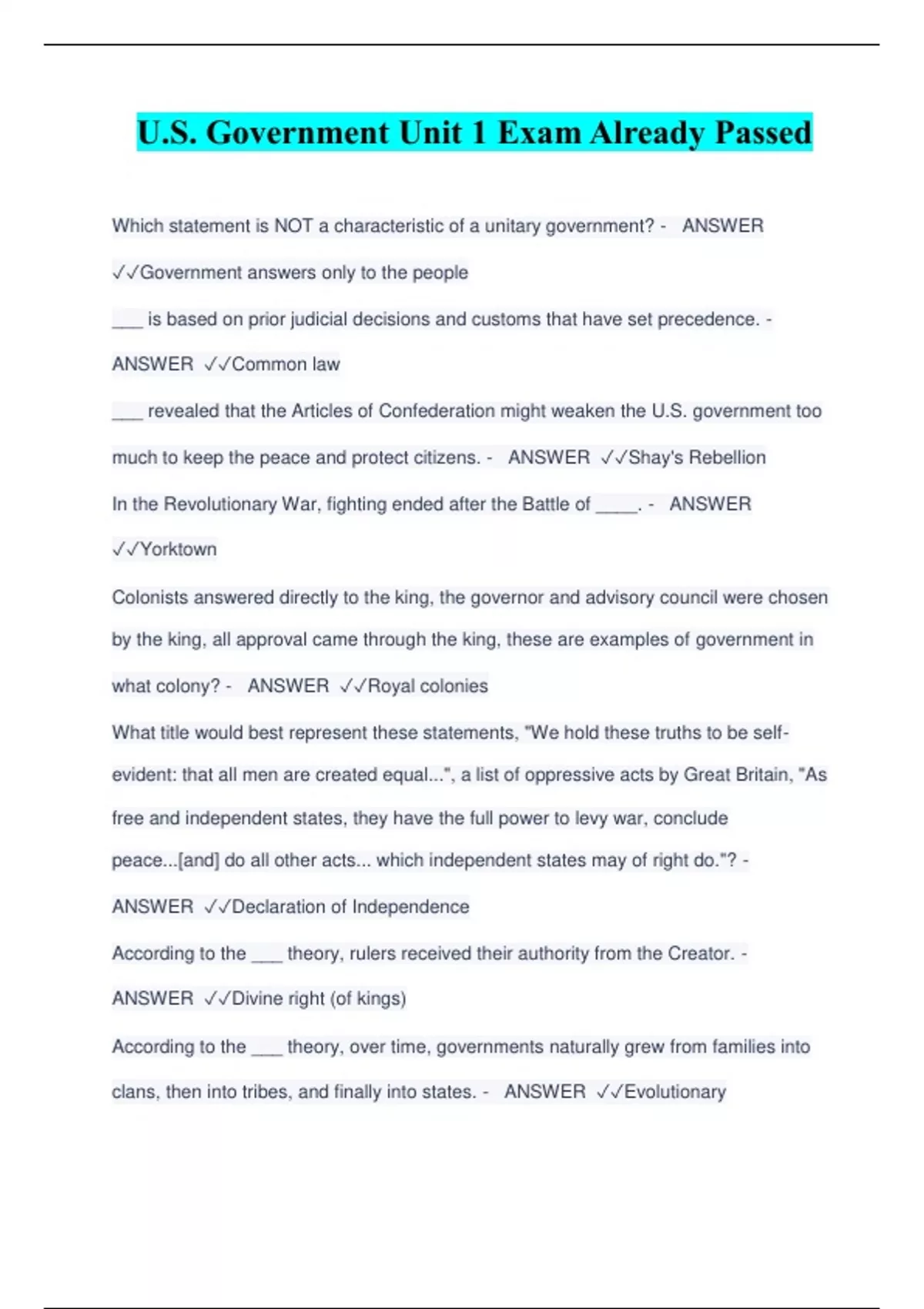 U.S. Government Unit 1 Exam Already Passed Which statement is NOT a characteristic of a unitary government? - ANSWER Government answers only to the people ___ is based on prior judicial decisions and customs that have set precedence. - ANSWER Common law ___ revealed that the Articles of Confederation might weaken the U.S. government too much to keep the peace and protect citizens. - ANSWER Shay's Rebellion In the Revolutionary War, fighting ended after the Battle of ____. - ANSWER Yorktown Colonists answered directly to the king, the governor and advisory council were chosen by the king, all approval came through the king, these are examples of government in what colony? - ANSWER Royal colonies What title would best represent these statements, "We hold these truths to be self-evident: that all men are created equal...", a list of oppressive acts by Great Britain, "As free and independent states, they have the full power to levy war, conclude peace...[and] do all other acts... which independent states may of right do."? - ANSWER Declaration of Independence According to the ___ theory, rulers received their authority from the Creator. - ANSWER Divine right (of kings) According to the ___ theory, over time, governments naturally grew from families into clans, then into tribes, and finally into states. - ANSWER Evolutionary