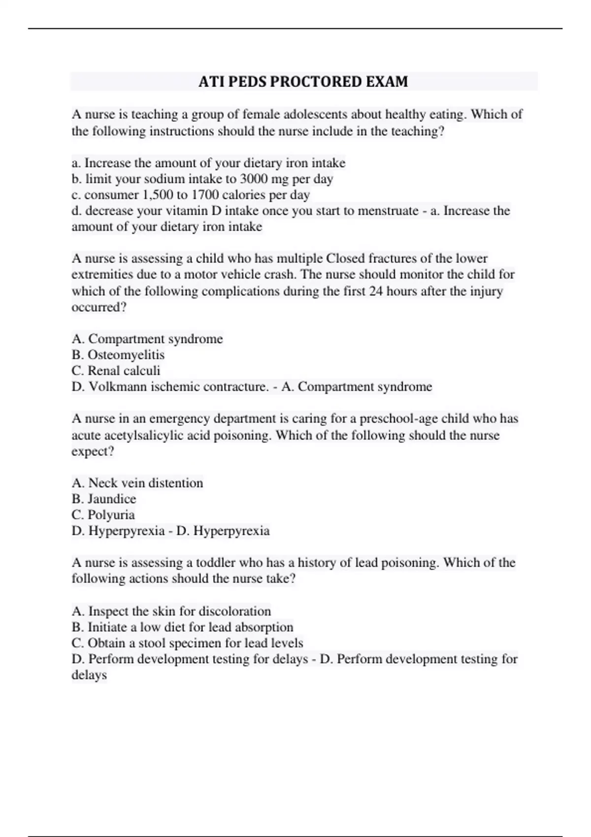 A nurse is teaching a group of female adolescents about healthy eating. Which of the following instructions should the nurse include in the teaching? a. Increase the amount of your dietary iron intake b. limit your sodium intake to 3000 mg per day c. consumer 1,500 to 1700 calories per day d. decrease your vitamin D intake once you start to menstruate - a. Increase the amount of your dietary iron intake A nurse is assessing a child who has multiple Closed fractures of the lower extremities due to a motor vehicle crash. The nurse should monitor the child for which of the following complications during the first 24 hours after the injury occurred? A. Compartment syndrome B. Osteomyelitis C. Renal calculi D. Volkmann ischemic contracture. - A. Compartment syndrome A nurse in an emergency department is caring for a preschool-age child who has acute acetylsalicylic acid poisoning. Which of the following should the nurse expect? A. Neck vein distention B. Jaundice C. Polyuria D. Hyperpyrexia - D. Hyperpyrexia A nurse is assessing a toddler who has a history of lead poisoning. Which of the following actions should the nurse take? A. Inspect the skin for discoloration B. Initiate a low diet for lead absorption C. Obtain a stool specimen for lead levels D. Perform development testing for delays - D. Perform development testing for delaysA nurse teaches about growth and development to a parent of a 12- years old child. The nurse should instruct the parent to expect the child to exhibit the following characteristics during early adolescence? A. Emotional separation from parents B. Decelerating growth rate. C. Mood swings D. Increased self-esteem. - C. Mood swings A nurse preparing to administer ondansetron 0.15mg/kg IV to a child receiving chemotherapy and weighs 29.4 kg. Available is ondansetron 4mg/2 ml solution. How many mL should the nurse administer? (Round the answer to the nearest tenth. Use a leading zero if it applies. Do not use a trailing zero). mL - 2.2 mL A nurse reviews the laboratory result of a preschooler who has gastroenteritis and notes the client's potassium level is 3.2 mEq/L. Which of the following assessment findings should the nurse expect? A. Hypertension B. Oliguria C. Hyporeflexia D. Hyperactive bowel sounds. - B. Oliguria A nurse is assessing a toddler who is 8 hr postoperative following a cardiac catheterization procedure. Which of the following findings should the nurse report to the provider? A. Bilateral extremities B. Weak pedal pulse distal to the site C. Serum glucose 90 mg/dl D. Blood pressure 102/58 mm Hg. - B. Weak pedal pulse distal to the site A school nurse is assessing a 7 year old student. The nurse should identify which of the following findings is a potential indicator of physical abuse? A. Abrasions on the knees B. Front deciduous teeth missing C. Weight in 45th percentile D. Bruising around the wrists - D. Bruising around the wristsA nurse is teaching the parents of a school-age child about bicycle safety. Which of the following instructions should the nurse include in the teaching? A. Your child should walk the bicycle through intersections B. Your child should keep the bicycle at least 3 feet from the curb while riding in the street. C. Your child should ride the bicycle against the flow of traffic D. Your child's feet should be 3 to 6 inches off the ground when seated on the bicycle. - A. Your child should walk the bicycle through intersections A charge nurse is teaching a group of nurses about identifying child abuse. Which of the following findings should the nurse identify as a potential indicator of child abuse? A. A toddler repeatedly refuses to let a nurse auscultate his lungs B. A toddler has bruises on his knees. C. An 8-month-old infant cries when his parent levels the room. D. A mother is hesitant to comfort her 6-month-old infant. - D. A mother is hesitant to comfort her 6-month-old infant. A nurse is teaching the guardian of 5- years old child who has encopresis (fecal incontinence) about managing the condition. Which of the following statements by the guardian indicates an understanding of the teaching? A. I will limit my child's fluid intakes B. I will increase my child's diary intakes C. I will have my child try to defecate 15 minutes after each meal D. I will have my child sit on the toilet for 20 minutes at a time. - C. I will have my child try to defecate 15 minutes after each meal