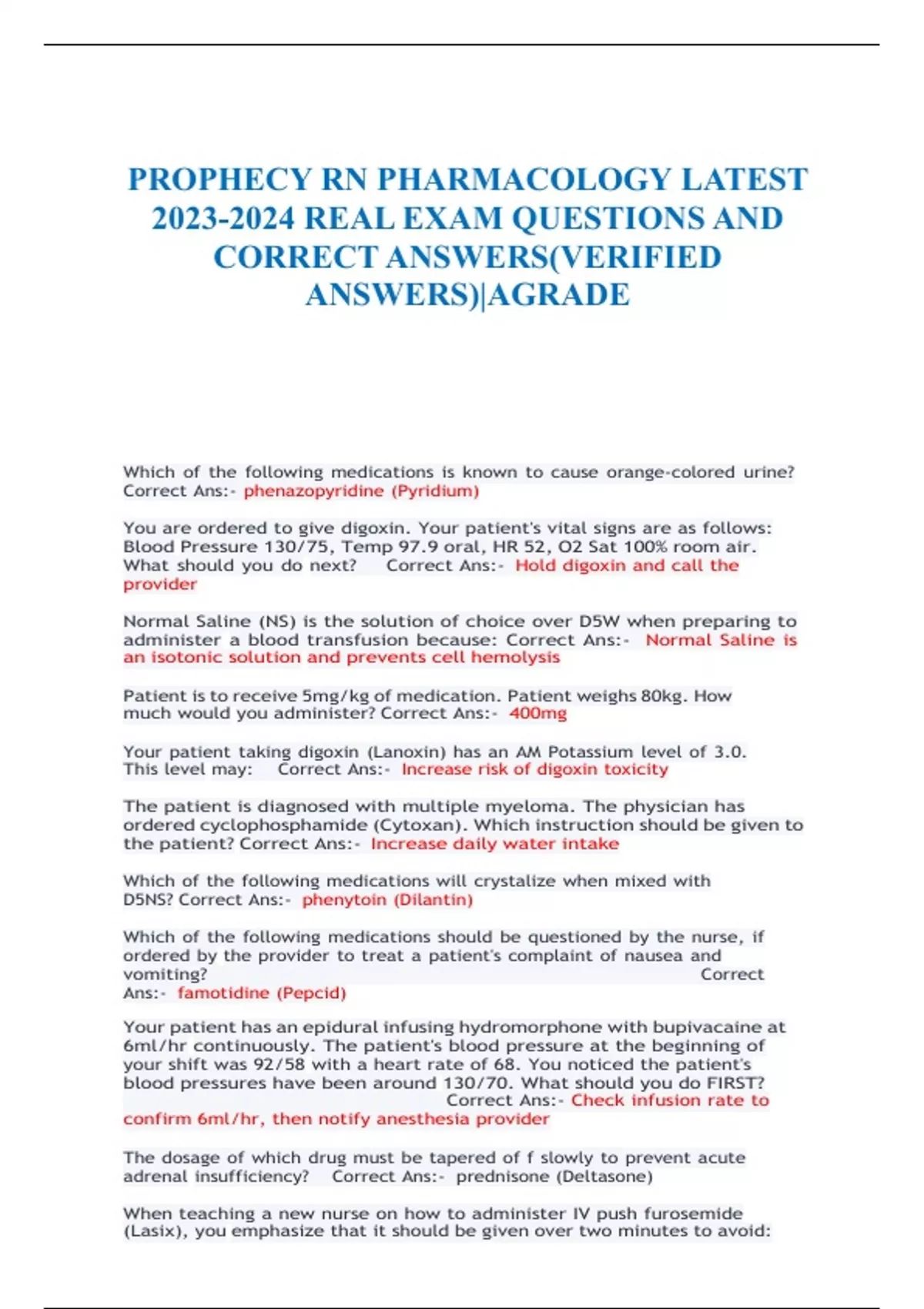 PROPHECY RN PHARMACOLOGY LATEST REAL EXAM QUESTIONS AND CORRECT ANSWERS(VERIFIED ANSWERS)|AGRADE