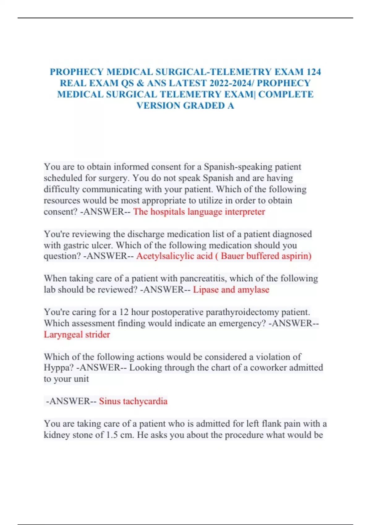 PROPHECY MEDICAL SURGICAL-TELEMETRY EXAM 124 REAL EXAM QS & ANS LATEST / PROPHECY MEDICAL SURGICAL TELEMETRY EXAM| COMPLETE VERSION GRADED A