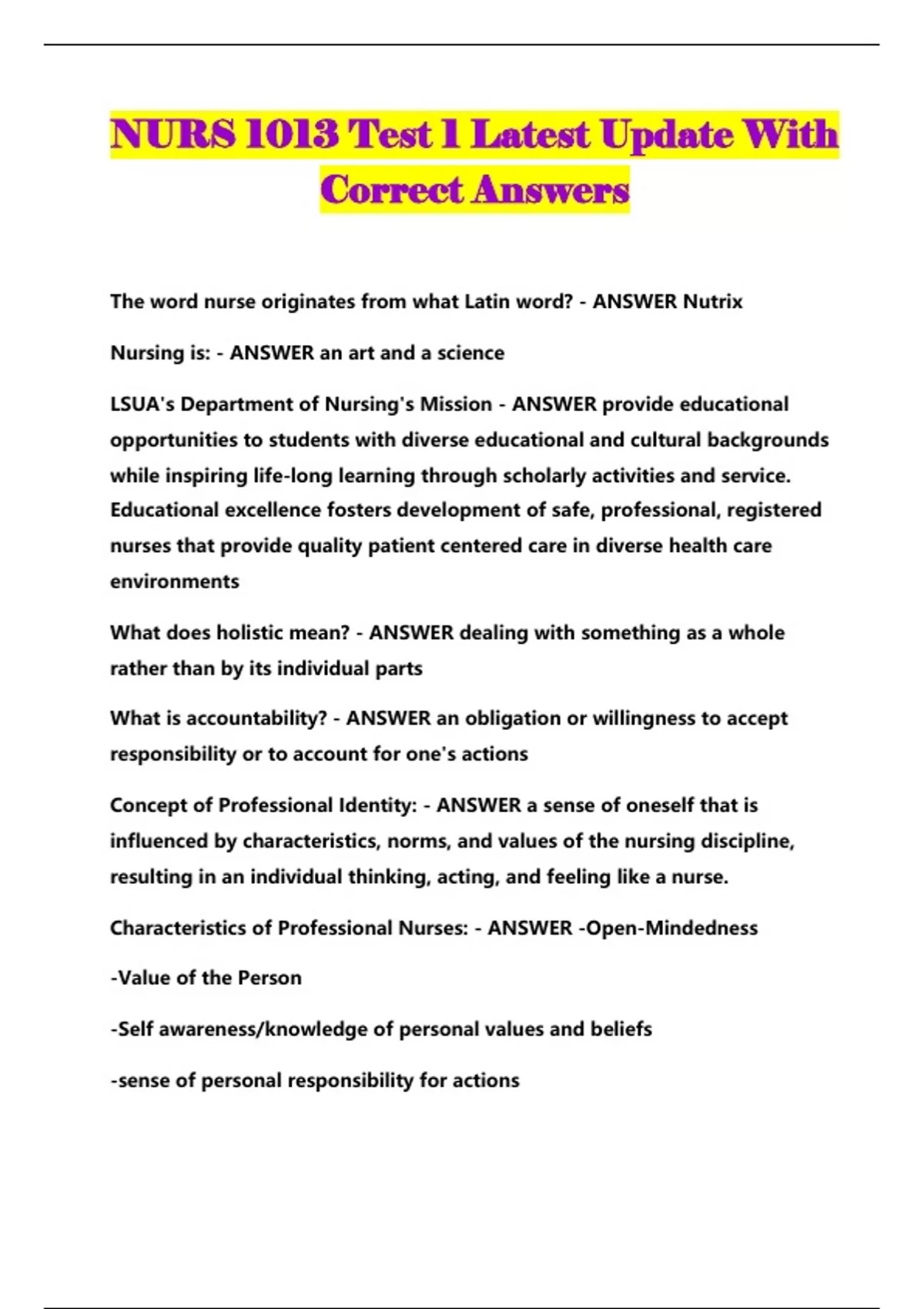 NURS 1013 Test 1 Latest Update With Correct Answers...
