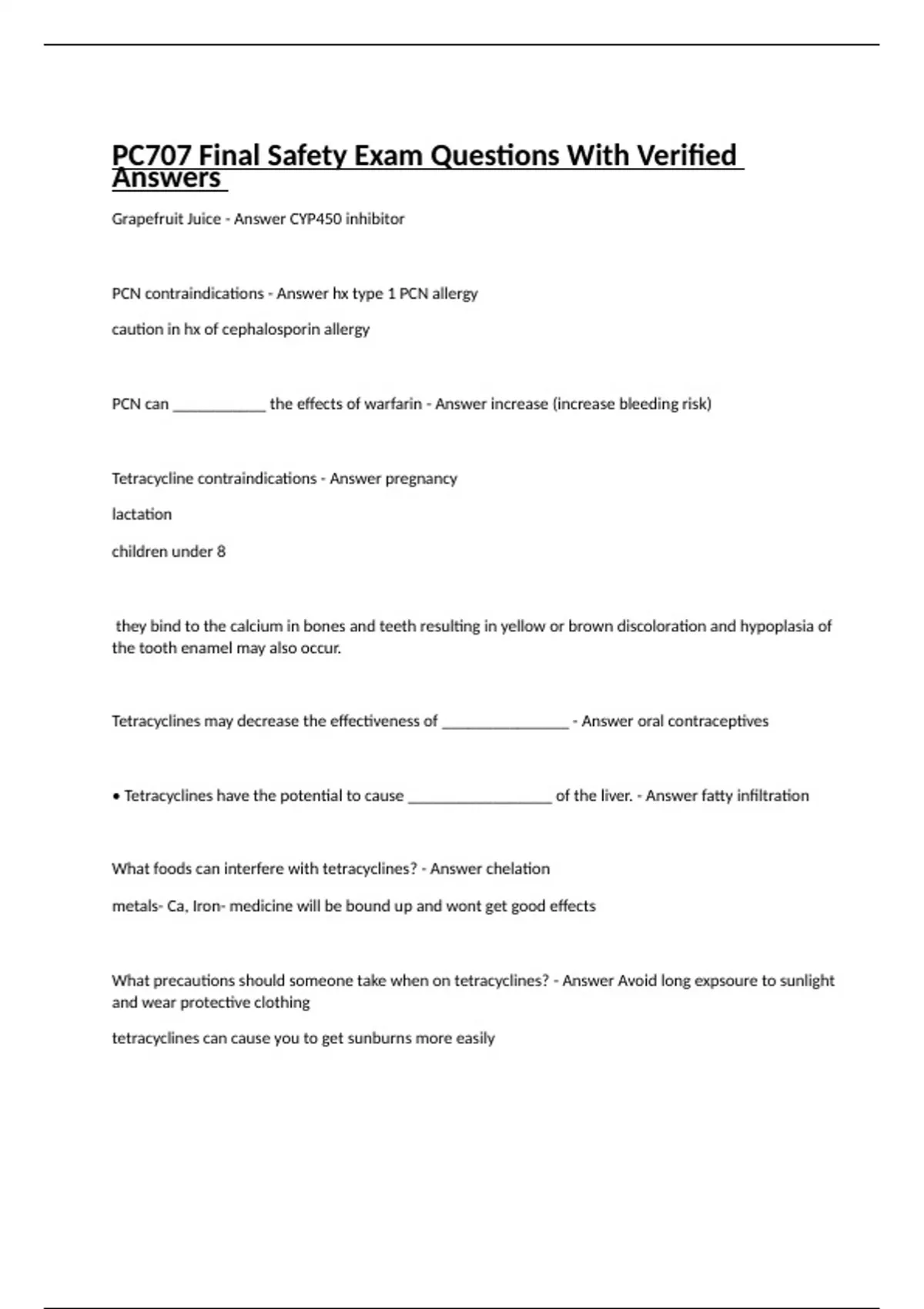 Grapefruit Juice - Answer CYP450 inhibitor PCN contraindications - Answer hx type 1 PCN allergy caution in hx of cephalosporin allergy PCN can ___________ the effects of warfarin - Answer increase (increase bleeding risk) Tetracycline contraindications - Answer pregnancy lactation children under 8 they bind to the calcium in bones and teeth resulting in yellow or brown discoloration and hypoplasia of the tooth enamel may also occur. Tetracyclines may decrease the effectiveness of _______________ - Answer oral contraceptives • Tetracyclines have the potential to cause _________________ of the liver. - Answer fatty infiltration What foods can interfere with tetracyclines? - Answer chelation metals- Ca, Iron- medicine will be bound up and wont get good effects What precautions should someone take when on tetracyclines? - Answer Avoid long expsoure to sunlight and wear protective clothing tetracyclines can cause you to get sunburns more easily drink lots of water to prevent crystals forming in urine Tetracyclines may increase the activity of ________________ - Answer warfarin Are fluoroquinolones safe during pregnancy or lactation? - Answer No Are fluoroquinolones safe for children? - Answer No, not under age 18 If someone has underlying ___________ or ________________, you should use fluoroquinolones with caution. - Answer Use with caution in underlying CNS pathology and renal impairment. can cause seizures What is the black box warning for fluoroquinolones? - Answer risk for tendon rupture When taking levofloxacin (levaquin), a fluoroquinolone, what patients in particular have increased risk of tendon rupture? - Answer individuals over 60 years of age, those taking corticosteroids, and patients with organ transplants. Aside from tendon rupture, what are other potential side effects of levofloxacin (levaquin)? - Answer Potential side effects include non-reversible peripheral neuropathy, hepatotoxicity, hematologic disorders and seizures, anxiety, confusion, and depression. Fluoroquinolones can cause harm to which organ? For this reason, what precautions should prescribers take? - Answer Evaluate liver function before initiating fluoroquinolone (FQ) therapy, and avoid prescribing these antibiotics for patients at increased risk for hepatotoxicity. Fluoroquinolones can cause - Answer QT prolongation Are fluoroquinolones prone to drug-drug interactions? - Answer Yes increased warfarin effects increased tendon rupture with glucocorticoids increased risk for QT interval prolongation with antinarrythmics What should be avoided within 2hrs of taking fluoroquinolones? - Answer Ca, antacids, iron, magnesium, dairy, etc What do you most commonly see with Sulfa (sulfonamide) allergies? - Answer Rash (Type 4, t cell mediated)--> d/c the drug Fever + Rash: stop drug immediately, usually happens in 1-3 days if someone has HIV, they react more frequently to Sulfa drugs--> consult and be careful Are sulfonamides safe during pregnancy? - Answer Should be avoided in both the first and third trimesters unless no other reasonable alternative is available. The mechanism of action is inhibition of folate metabolism, which may lead to cardiovascular defects and oral cleft defects. In the third trimester, the sulfa compounds compete for bilirubinbinding sites on fetal and neonatal albumin resulting in hyperbilirubinemia and kernicterus. Sulfonamides and lactation - Answer contraindicated, can cause kernicterus Sulfonamides and infants - Answer contraindicated in infants under 2months Sulfonamides should be used with caution in what populations - Answer •people with blood dyscrasias people with renal impairment people with folate deficiency people with recent gout attack people with peptic ulcer disease serious side effects of sulfonamides - Answer hemolytic anemia, thrombocytopenia, convulsions, hepatic necrosis, renal failure Steven Johnson Adverse reactions with sulfonamides are more common in people who have - Answer HIV Patient teaching with sulfonamides - Answer Minimum of 8-10 glass of water daily to minimize crystallization Avoid prolonged exposure to sunlight, wear protective clothing and sunscreen. The hearing loss associated with sulfonamides is/is not reversible - Answer Hearing loss is reversible 24 hours to 2 weeks after med is discontinued What can happen if a patient takes Trimethoprim and sulfamethoxazole (TMP-SMX) and warfarin? - Answer The combination increases the INR an average of 1.76 times increasing the potential for serious bleeding events What antibiotics in particular can interact with warfarin? - Answer Erythromycin, fluconazole, ketoconazole, itraconazole, metronidazole, Trimethoprim and sulfamethoxazole (TMP-SMX) Trimethoprim-sulfamethazole (TMP-SMX) is associated with the serious adverse effect of___________________ - Answer hyperkalemia. The risk of hyperkalemia when taking Trimethoprim-sulfamethazole (TMP-SMX) is increased when: - Answer Taking TMP-SMX and angiotensin converting inhibitors or angiotensin receptor blockers concurrently increases the risk of hyperkalemia and sudden cardiac death . TMP-SMX is also more likely to increase hyperkalemia in elderly patients and in patients with kidney disease. sulfonamides are contraindicated for babies who - Answer have either hyperbilirubinemia or G6PD deficiency Can you give a cephalosporin to a PCN allergic patient? - Answer Yes, except with type 1 allergic reaction (anaphylaxis) There is a risk for _____toxicity with macrolids - Answer ototoxicity • Concomitant use of other ototoxic drugs increases risk for ototoxicity. Macrolids can prolong the ____________ - Answer • QT interval What macrolids have more drug to drug reactions? - Answer • Clarithromycin, erythromycin and telithromycin more drug to drug interactions because of common CYP pathway Caution should be taken with macrolides and people with ___________ disease - Answer liver Be careful when prescribing Nucleoside Analogues antivirals to people with ______________ -