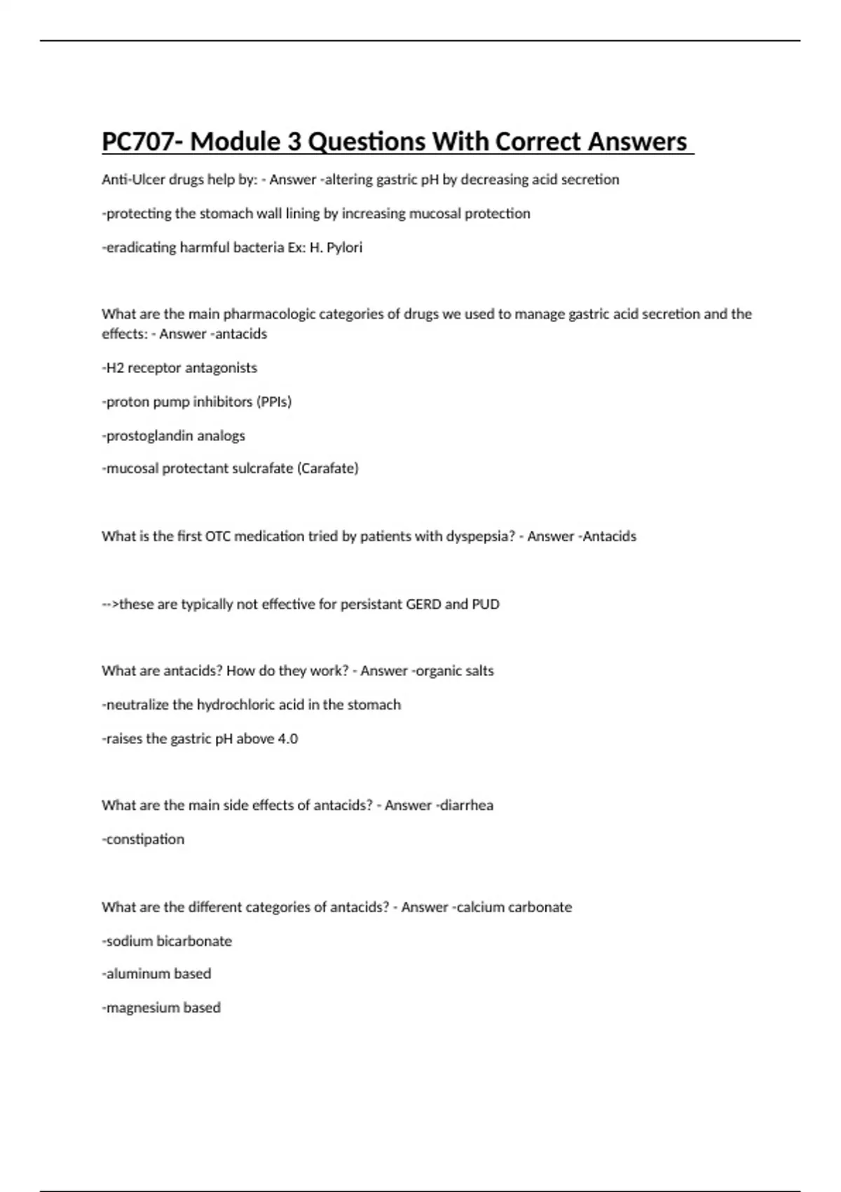 Anti-Ulcer drugs help by: - Answer -altering gastric pH by decreasing acid secretion -protecting the stomach wall lining by increasing mucosal protection -eradicating harmful bacteria Ex: H. Pylori What are the main pharmacologic categories of drugs we used to manage gastric acid secretion and the effects: - Answer -antacids -H2 receptor antagonists -proton pump inhibitors (PPIs) -prostoglandin analogs -mucosal protectant sulcrafate (Carafate) What is the first OTC medication tried by patients with dyspepsia? - Answer -Antacids -->these are typically not effective for persistant GERD and PUD What are antacids? How do they work? - Answer -organic salts -neutralize the hydrochloric acid in the stomach -raises the gastric pH above 4.0 What are the main side effects of antacids? - Answer -diarrhea -constipation What are the different categories of antacids? - Answer -calcium carbonate -sodium bicarbonate -aluminum based -magnesium based -aluminum hydroxide What is important teaching for patients taking antacids? - Answer -decreasing the stomach pH can cause the decrease absorption of drugs that rely on acidic conditions -if taking enteric coated medications--reducing stomach acid can cause the medication to dissolve and absorb in the stomach instead of the intestine **always separate antacids from other medications by 2 hours** Calcium carbonate antacids: - Answer -Tums -can cause CONSTIPATION -require adequate fluid intake to dissolve -can be used in patients needing to take an antacid who also could benefit from extra calcium intake. -potential for milk "alkali" syndrome, metabolic alkalosis Sodium Bicarbonate antacids: - Answer -Alka Seltzer -contains aspirin (ASA) -potential to WORSEN GI distress. -increased risk for water retention and fluid overload -potential to cause hypertension -Contraindicated in pregnancy, children, patient with CVD* Aluminum based antacids: - Answer -Amphogel -can cause CONSTIPATION -requires adequate fluid intake to dissolve -Contraindicated in patients with renal insufficiency* Magnesium based antacids: - Answer -Milk of magnesia -suspension mixture is more effective -can cause DIARRHEA -Contraindicated in renal insufficiency* Aluminum hydroxide antacids: - Answer -may decrease the absorption of warfarin*. -can cause a chelating affect with drugs such as tetracyclines, warfarin, and digoxin—potentially decreasing their absorption & effectiveness -high affinity for phosphate—may cause hypophasphatemia What can cause heartburn in pregnancy? - Answer -hormonal fluctuations -anatomic changes Are antacids safe in pregnancy? - Answer -Yes, due to poor absorption -EXCEPT sodium bicarbonate (AlkaSeltzer) due to aspirin content, risk for fetal and maternal metabolic alkalosis, and fluid retention and overload* What are the typical order of interventions for pregnancy heartburn? - Answer -lifestyle changes then try antacids -Milk of magnesia is first line* --category B -Tums--category C -make sure to consider if she has diarrhea or constipation -if antacids fail to work--H2 receptor antagonists are next -Zantac is the most studied and deemed the safest H2 blocker in pregnancy*—however, Zantac currently is being investigated to have a carcinogen—Pepcid is a great alternative What are H2 receptor antagonists? How is it different from H1 receptor antagonists? - Answer -H2 receptors are primarily in the parietal cells of the stomach and when stimulated increase the secretion of gastric acid -H2 blockers help to competitively block the binding to these receptors--therefore decreasing acid secretion* -this is different from H1 blockers--which primarily blocks the histamine that is involved in allergic reactions What are the different types of H2 receptor antagonists? - Answer -cimetidine (Tagamet) -famotidine (Pepcid) -ranitidine (Zantac) -nizatidine (Axid) Why should cimetidine (Tagamet) be avoided whenever possible? - Answer -it is a potent CYP enzyme inhibitor causing deceased metabolism of many drugs--increasing drug levels* -many drug to drug interactions: warfarin, phenytoin, propanolol, nifidepine, chlondiapoxide, diazepam, lidocaine, tricyclic antidepressants, theophylline, metronidazole* Why is famotidine (Pepcid) a good go to drug for H2 antagonist? - Answer -least CYP inhibitor effect -fewer drug to drug interactions Why is it important to document a thorough assessment of different drugs the patient has tried to relieve dyspepsia? - Answer -many insurance companies require a step-wise approach to prescribing before approving -antacids-->H2 blockers-->PPIs What are the only lifestyle changes that could reduce the symptoms of GERD? - Answer -elevation of HOB -weight loss -avoiding meals 2-3 hours before bed Plans for treating GERD begins with determining the severity of symptoms. True or false? - Answer -true -if a patient comes in with moderate-severe GERD OR erosive disease and they most likely have already tried antacids and/or H2 blockers--next step is PPIs* -if a patient comes in with mild GERD they may or may not have tried antacids, if so--try H2 blockers* It's very important to educate patients to take antacids & vitamins/iron supplements: - Answer -at least 2 hours apart -taking them together can cause little to no absorption of the vitamins/supplements and may cause deficiencies Pepto-Bismol (bismuth subsalicylate) take aways: - Answer -not known to be effective for dyspepsia -may change the color of stool to black -Contraindicated in pregnancy, lactation, and children <12 due to aspirin content* -antimicrobial, antisecretory, mild anti-inflammatory -May cause black tongue -could be used as adjunctive in tx of H. Pylori What is metoclorpramide (Reglan)? - Answer -dopamine antagonist -promotes gastric emptying (prokinetic) -tones the lower esophageal sphincter -occasionally is used in pregnancy -risk for tardive dyskinesia* BLACK BOX WARNING: Reglan - Answer -chronic use is associated with tardive dyskinesia -can be irreversible -should be avoided i