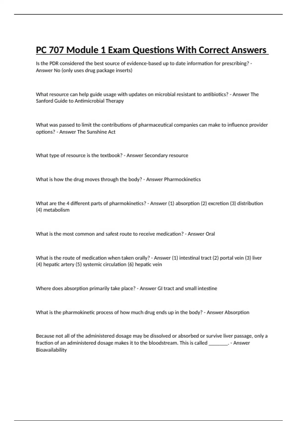 Is the PDR considered the best source of evidence-based up to date information for prescribing? - Answer No (only uses drug package inserts) What resource can help guide usage with updates on microbial resistant to antibiotics? - Answer The Sanford Guide to Antimicrobial Therapy What was passed to limit the contributions of pharmaceutical companies can make to influence provider options? - Answer The Sunshine Act What type of resource is the textbook? - Answer Secondary resource What is how the drug moves through the body? - Answer Pharmockinetics What are the 4 different parts of pharmokinetics? - Answer (1) absorption (2) excretion (3) distribution (4) metabolism What is the most common and safest route to receive medication? - Answer Oral What is the route of medication when taken orally? - Answer (1) intestinal tract (2) portal vein (3) liver (4) hepatic artery (5) systemic circulation (6) hepatic vein Where does absorption primarily take place? - Answer GI tract and small intestine What is the pharmokinetic process of how much drug ends up in the body? - Answer Absorption Because not all of the administered dosage may be dissolved or absorbed or survive liver passage, only a fraction of an administered dosage makes it to the bloodstream. This is called _______. - Answer Bioavailability What is the maximum blood level that is achieved following drug administration? - Answer Peak Blood Level What is the process of moving drugs throughout the body? - Answer Distribution What protein do most drugs bind to? - Answer Albumin If a drug is all bound in protein, is it more or less available? - Answer Less available If a patient has more protein binding, do you need to increase or decrease dosing of the drug? - Answer increase Drugs that are ________ are not able to activate receptors unless they are free - Answer Protein bound Stopping or starting a drug that binds to plasma protein changes the free drug levels of other __________. - Answer Protein bound drugs What is a hypothetical value that reflects the volume in which a drug would need to dissolved to explain the relationship between dosage and blood levels? - Answer Volume distribution What is a drug that binds to a receptor and activates the receptor to produce a biological response? - Answer Agonist What is a drug that binds to a receptor and does not allow a drug to bind thus making the drug inactive? - Answer Antagonist Where are most drugs excreted? - Answer Kidneys Where do drugs break down in the body? - Answer Liver (via enzymatic processes) What is the process of changing one chemical into another, and the process either creates or uses energy? - Answer metabolism Metabolism (Review CYP450 metabolism. Understand the difference between inducers and inhibitors. What happens if two drugs are taken that use the same pathway?) - Answer One may inhibit and one may enhance the system, it will lead to increases or decreases of different drugs If enzyme prevent CYP450, what will happen to the drug in the body? - Answer Increase in pharamacologic action of drug What are some typical CYP450 enzyme inhibitors? - Answer (1) Depakote (2) isoniazid (3) erythromycin (4) grapefruit juice (5) Tagamet (6) ketoconazole (7) flucanozole (8) alcohol (9) chloramphenicol (10) sulfonamides (11) ciprofloxacin (12) omeprazole (13) metronidazole What food decreases the CYP450 enzymes? - Answer Grapefruit juice More CYP450 enzyme will result in what with drugs people are taking? - Answer Decrease the amount of drug available What results in increased metabolism and decreased pharmacological action of the drug? - Answer Enzyme induction What results in a decreased cytochrome P450 enzymes and increased pharmacologic action of the drug? - Answer Enzyme inhibition What is a pharmacologically inactive medication that are metabolized into the active form within the body? - Answer Pro drug Ultra-rapid metabolizer (Explain ultra-rapid metabolizers. How do these differ from poor to intermediate metabolizers?) - Answer prodrugs are rapidly metabolized into active drug. Active drug is rapidly metabolized into inactive metabolite leading to potential therapeutic failure. Patient requires higher doses of active drug. What is it when a person has more than one functioning copy of a certain enzyme and metabolize drugs at a very fast rate? - Answer Ultra rapid metabolizer What inactivates the drug and less will reach the system? - Answer Hepatic first-pass