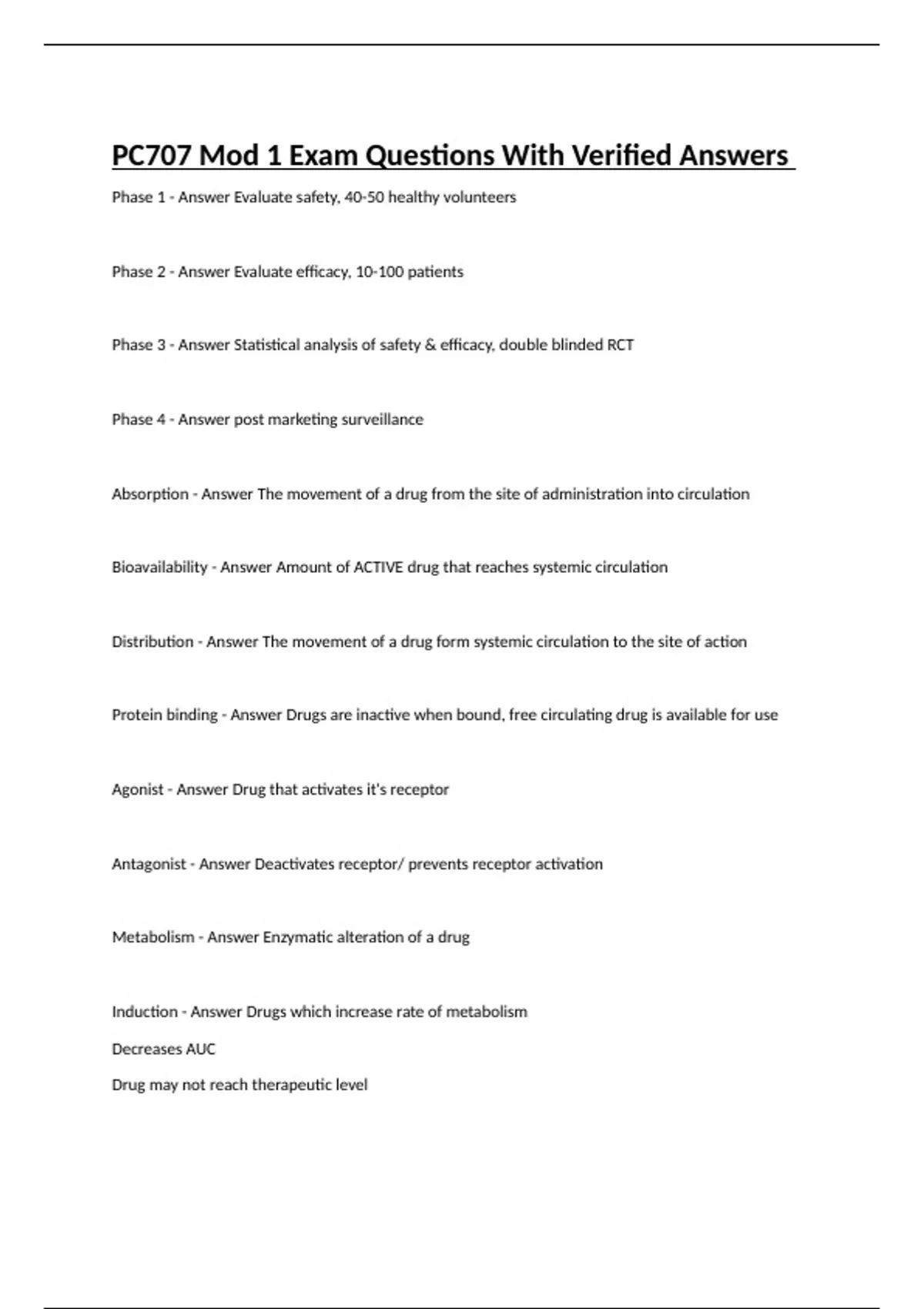 Phase 1 - Answer Evaluate safety, 40-50 healthy volunteers Phase 2 - Answer Evaluate efficacy, 10-100 patients Phase 3 - Answer Statistical analysis of safety & efficacy, double blinded RCT Phase 4 - Answer post marketing surveillance Absorption - Answer The movement of a drug from the site of administration into circulation Bioavailability - Answer Amount of ACTIVE drug that reaches systemic circulation Distribution - Answer The movement of a drug form systemic circulation to the site of action Protein binding - Answer Drugs are inactive when bound, free circulating drug is available for use Agonist - Answer Drug that activates it's receptor Antagonist - Answer Deactivates receptor/ prevents receptor activation Metabolism - Answer Enzymatic alteration of a drug Induction - Answer Drugs which increase rate of metabolism Decreases AUC Drug may not reach therapeutic level Inhibitors - Answer Drugs that decrease the rate of metabolism Increased AUC Drug may become toxic/ more severe adverse effects Prodrug - Answer Drug which is inactive until it is metabolized Able to cross BBB prior to activation