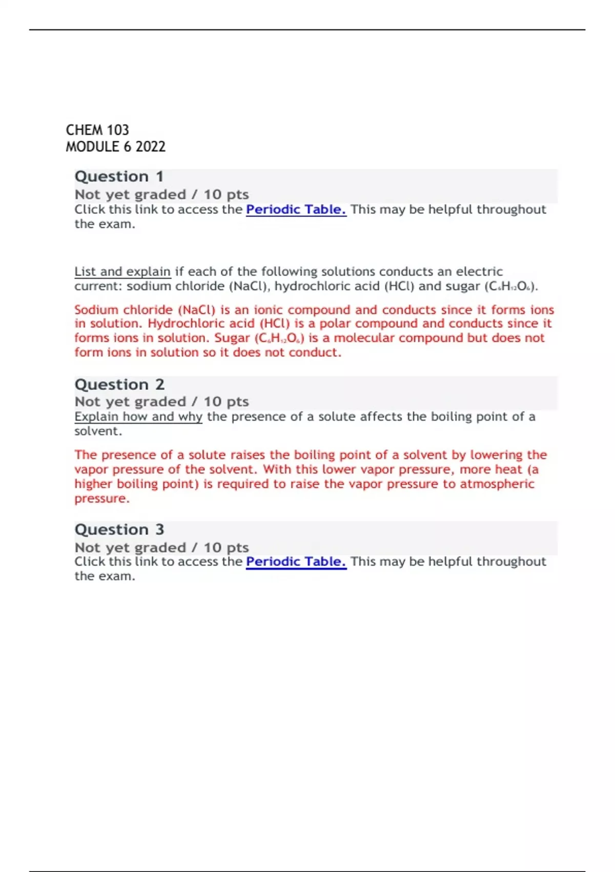 CHEM 103 MODULE 6 2022 Click this link to access the Periodic Table. This may be helpful throughout the exam. List and explain if each of the following solutions conducts an electric current: sodium chloride (NaCl), hydrochloric acid (HCl) and sugar (C6H12O6). Sodium chloride (NaCl) is an ionic compound and conducts since it forms ions in solution. Hydrochloric acid (HCl) is a polar compound and conducts since it forms ions in solution. Sugar (C6H12O6) is a molecular compound but does not form ions in solution so it does not conduct. Explain how and why the presence of a solute affects the boiling point of a solvent. The presence of a solute raises the boiling point of a solvent by lowering the vapor pressure of the solvent. With this lower vapor pressure, more heat (a higher boiling point) is required to raise the vapor pressure to atmospheric pressure. Click this link to access the Periodic Table. This may be helpful throughout the exam.