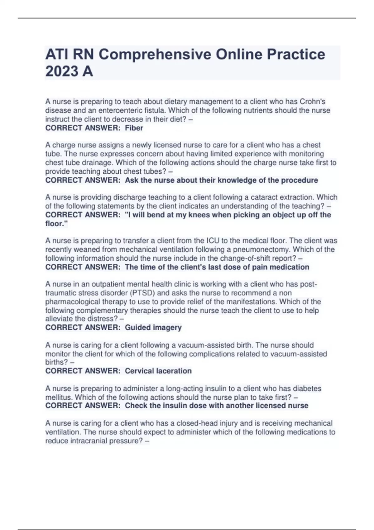 ATI RN Comprehensive Online Practice 2023 A A nurse is preparing to teach about dietary management to a client who has Crohn's disease and an enteroenteric fistula. Which of the following nutrients should the nurse instruct the client to decrease in their diet? – CORRECT ANSWER: Fiber A charge nurse assigns a newly licensed nurse to care for a client who has a chest tube. The nurse expresses concern about having limited experience with monitoring chest tube drainage. Which of the following actions should the charge nurse take first to provide teaching about chest tubes? – CORRECT ANSWER: Ask the nurse about their knowledge of the procedure A nurse is providing discharge teaching to a client following a cataract extraction. Which of the following statements by the client indicates an understanding of the teaching? – CORRECT ANSWER: "I will bend at my knees when picking an object up off the floor." A nurse is preparing to transfer a client from the ICU to the medical floor. The client was recently weaned from mechanical ventilation following a pneumonectomy. Which of the following information should the nurse include in the change-of-shift report? – CORRECT ANSWER: The time of the client's last dose of pain medication A nurse in an outpatient mental health clinic is working with a client who has posttraumatic stress disorder (PTSD) and asks the nurse to recommend a non pharmacological therapy to use to provide relief of the manifestations. Which of the following complementary therapies should the nurse teach the client to use to help alleviate the distress? – CORRECT ANSWER: Guided imagery A nurse is caring for a client following a vacuum-assisted birth. The nurse should monitor the client for which of the following complications related to vacuum-assisted births? – CORRECT ANSWER: Cervical laceration A nurse is preparing to administer a long-acting insulin to a client who has diabetes mellitus. Which of the following actions should the nurse plan to take first? – CORRECT ANSWER: Check the insulin dose with another licensed nurse A nurse is caring for a client who has a closed-head injury and is receiving mechanical ventilation. The nurse should expect to administer which of the following medications to reduce intracranial pressure? – CORRECT ANSWER: Mannitol A home health care nurse is developing a teaching plan for a client who has a new ileostomy. Which of the following instructions should the nurse include? – CORRECT ANSWER: Empty the appliance when it is one-third to one-half full A nurse in an outpatient mental health clinic is caring for four clients. The nurse should recognize that which of the following clients is effectively using sublimation as a defense mechanism? – CORRECT ANSWER: A client who channels their energy into a new hobby following the loss of their job A nurse is teaching about total parenteral nutrition (TPN) and IV lipid emulsions with a client who has an extensive burn injury. Which of the following information should the nurse include? – CORRECT ANSWER: "You will receive fingersticks for blood glucose testing." A nurse in the emergency department is assessing a preschooler who has a facial laceration. The nurse should identify which of the following findings as a potential indication of child sexual maltreatment? – CORRECT ANSWER: The child exhibits discomfort while walking A nurse is administering cyclophosphamide orally to a school-age child who has neuroblastoma. Which of the following actions should the nurse take when administering this medication? – CORRECT ANSWER: Maintain hydration with liberal fluid intake A hospice nurse is consulting with a client and her family about receiving home services. Which of the following statements should the nurse identify as an indication that the family understands home hospice care? – CORRECT ANSWER: "We can expect the hospice nurse to provide support for us after our mother's death." The nurse is caring for a client who is receiving a continuous heparin infusion. Which of the following laboratory tests should the nurse review prior to adjusting the client's heparin? – CORRECT ANSWER: aPTT A nurse is caring for a client who has a potassium level of 3 mEq/L (3.5 to 5 mEq/L). Which of the following manifestations should the nurse monitor? – CORRECT ANSWER Decreased deep tendon reflexes