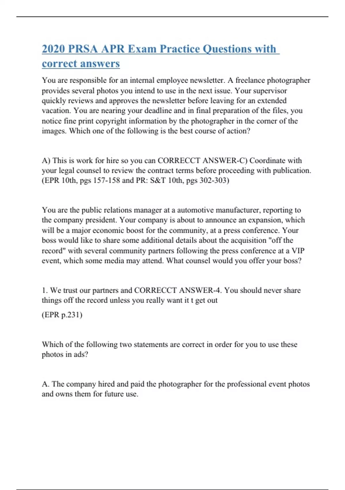 You are responsible for an internal employee newsletter. A freelance photographer provides several photos you intend to use in the next issue. Your supervisor quickly reviews and approves the newsletter before leaving for an extended vacation. You are nearing your deadline and in final preparation of the files, you notice fine print copyright information by the photographer in the corner of the images. Which one of the following is the best course of action? A) This is work for hire so you can CORRECCT ANSWER-C) Coordinate with your legal counsel to review the contract terms before proceeding with publication. (EPR 10th, pgs 157-158 and PR: S&T 10th, pgs 302-303) You are the public relations manager at a automotive manufacturer, reporting to the company president. Your company is about to announce an expansion, which will be a major economic boost for the community, at a press conference. Your boss would like to share some additional details about the acquisition "off the record" with several community partners following the press conference at a VIP event, which some media may attend.
