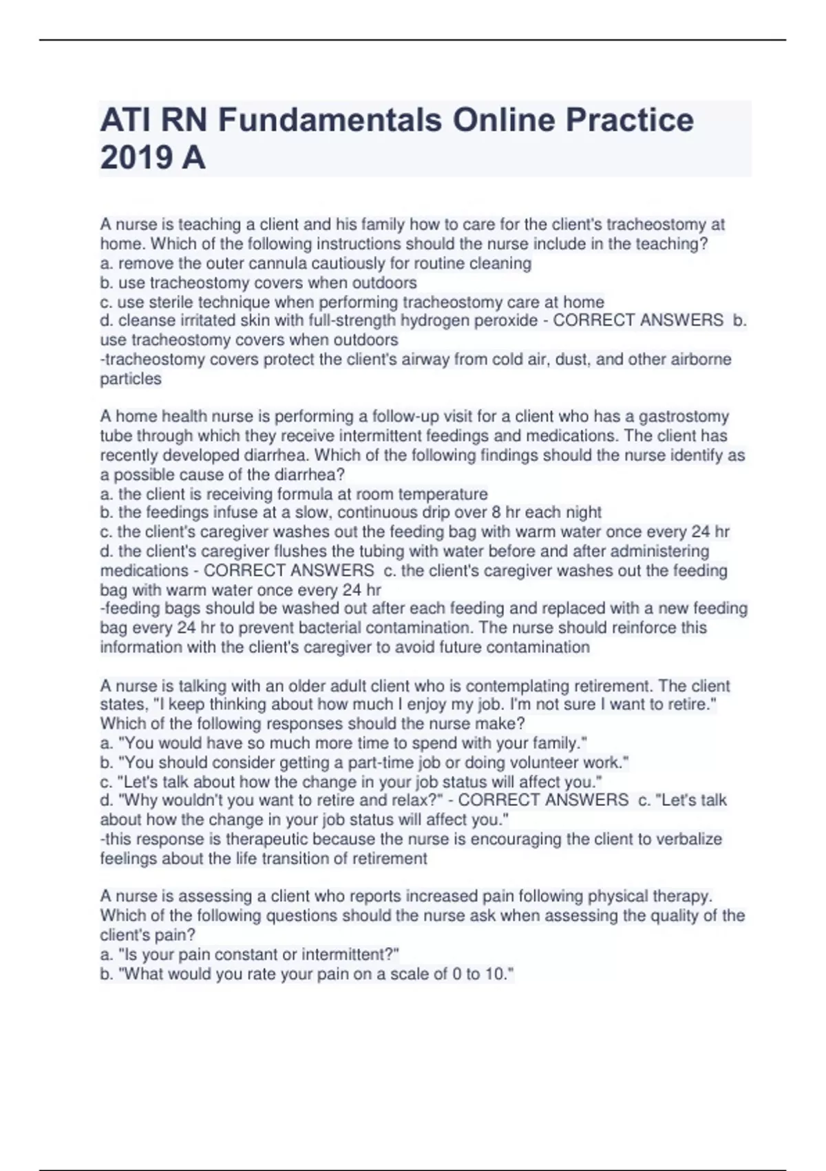 ATI RN Fundamentals Online Practice 2019 A A nurse is teaching a client and his family how to care for the client's tracheostomy at home. Which of the following instructions should the nurse include in the teaching? a. remove the outer cannula cautiously for routine cleaning b. use tracheostomy covers when outdoors c. use sterile technique when performing tracheostomy care at home d. cleanse irritated skin with full-strength hydrogen peroxide - CORRECT ANSWERS b. use tracheostomy covers when outdoors -tracheostomy covers protect the client's airway from cold air, dust, and other airborne particles A home health nurse is performing a follow-up visit for a client who has a gastrostomy tube through which they receive intermittent feedings and medications. The client has recently developed diarrhea. Which of the following findings should the nurse identify as a possible cause of the diarrhea? a. the client is receiving formula at room temperature b. the feedings infuse at a slow, continuous drip over 8 hr each night c. the client's caregiver washes out the feeding bag with warm water once every 24 hr d. the client's caregiver flushes the tubing with water before and after administering medications - CORRECT ANSWERS c. the client's caregiver washes out the feeding bag with warm water once every 24 hr -feeding bags should be washed out after each feeding and replaced with a new feeding bag every 24 hr to prevent bacterial contamination. The nurse should reinforce this information with the client's caregiver to avoid future contamination A nurse is talking with an older adult client who is contemplating retirement. The client states, "I keep thinking about how much I enjoy my job. I'm not sure I want to retire." Which of the following responses should the nurse make? a. "You would have so much more time to spend with your family." b. "You should consider getting a part-time job or doing volunteer work." c. "Let's talk about how the change in your job status will affect you." d. "Why wouldn't you want to retire and relax?" - CORRECT ANSWERS c. "Let's talk about how the change in your job status will affect you." -this response is therapeutic because the nurse is encouraging the client to verbalize feelings about the life transition of retirement A nurse is assessing a client who reports increased pain following physical therapy. Which of the following questions should the nurse ask when assessing the quality of the client's pain? a. "Is your pain constant or intermittent?" b. "What would you rate your pain on a scale of 0 to 10." c. "Does the pain radiate?" d. "Is your pain sharp or dull?" - CORRECT ANSWERS d. "Is your pain sharp or dull?" -asking the client whether the pain is sharp, dull, crushing, throbbing, aching, burning, electric-like, or shooting helps determine the quality of the pain. A nurse is caring for a client who is expressing anger about his diagnosis of colorectal cancer. Which of the following actions should the nurse take? a. discuss the risk factors of colon cancer b. focus teaching on what the client will need to do in the future to manage his illness c. provide the client with written information about the phases of loss and grief d. reassure the client that this is an expected response to grief - CORRECT ANSWERS d. reassure the client that this is an expected response to grief -during the anger stage of the client's psychosocial adaptation to illness, the nurse should support the client and explain that this is an expected reaction to a cancer diagnosis A nurse on a medical-surgical unit is caring for a client who has a new prescription for wrist restraints. Which of the following actions should the nurse take? a. pad the client's wrist before applying the restraints b. evaluate the client's circulation every 8 hr after application c. remove the restraints every 4 hr to evaluate the client's status d. secure the restraint ties to the bed's side rails - CORRECT ANSWERS a. pad the client's wrist before applying the restraints -the use of restraints without padding can abrade the client's skin, resulting in client injury A nurse is performing a home safety assessment for a client who is receiving supplemental oxygen. Which of the following observations should the nurse identify as proper safety protocol? a. the client uses a wool blanket on their bed b. the client uses nonacetone nail polish remover c. the client stores an extra oxygen tank on its side under their bed d. the client has a weekly inspection checklist for oxygen equipment - CORRECT ANSWERS b. the client uses nonacetone nail polish remover -the client should use nonflammable materials, such as non-acetone nail polish remover, while using supplemental oxygen A nurse is caring for a client who has a respiratory infection. Which of the following techniques should the nurse use when performing nasotracheal suctioning for the client?