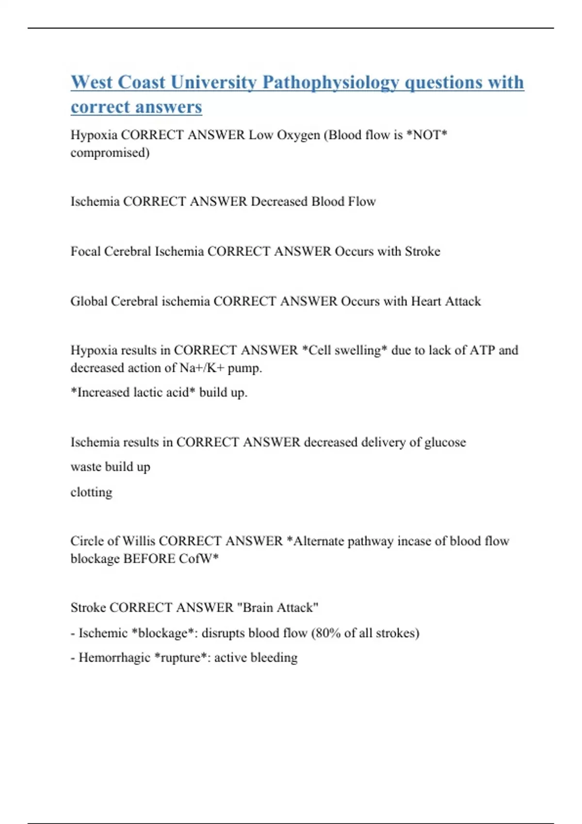 Hypoxia CORRECT ANSWER Low Oxygen (Blood flow is *NOT* compromised) Ischemia CORRECT ANSWER Decreased Blood Flow Focal Cerebral Ischemia CORRECT ANSWER Occurs with Stroke Global Cerebral ischemia CORRECT ANSWER Occurs with Heart Attack Hypoxia results in CORRECT ANSWER *Cell swelling* due to lack of ATP and decreased action of Na+/K+ pump. *Increased lactic acid* build up. Ischemia results in CORRECT ANSWER decreased delivery of glucose waste build up clotting Circle of Willis CORRECT ANSWER *Alternate pathway incase of blood flow blockage BEFORE CofW*