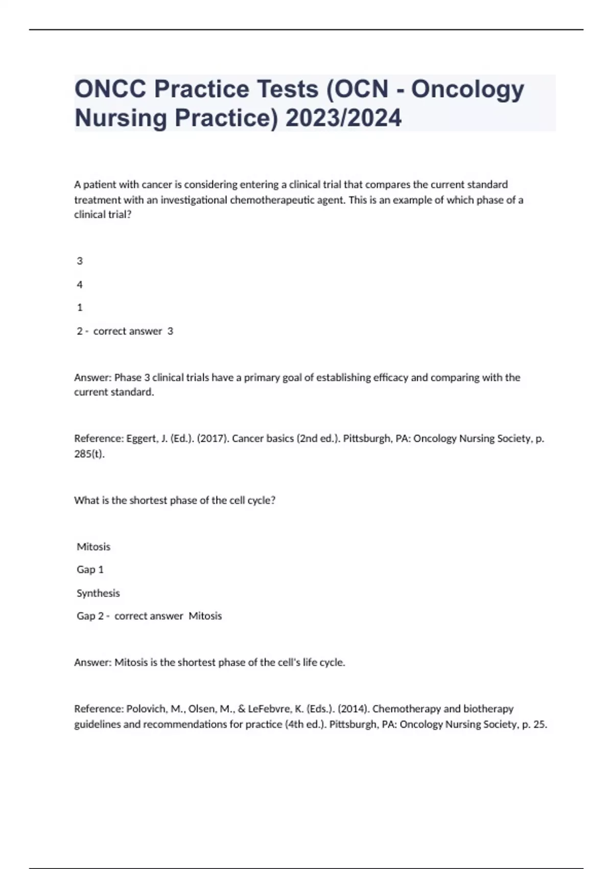 A patient with cancer is considering entering a clinical trial that compares the current standard treatment with an investigational chemotherapeutic agent. This is an example of which phase of a clinical trial? 3 4 1 2 - correct answer 3 Answer: Phase 3 clinical trials have a primary goal of establishing efficacy and comparing with the current standard. Reference: Eggert, J. (Ed.). (2017). Cancer basics (2nd ed.). Pittsburgh, PA: Oncology Nursing Society, p. 285(t). What is the shortest phase of the cell cycle? Mitosis Gap 1 Synthesis Gap 2 - correct answer Mitosis Answer: Mitosis is the shortest phase of the cell's life cycle. Reference: Polovich, M., Olsen, M., & LeFebvre, K. (Eds.). (2014). Chemotherapy and biotherapy guidelines and recommendations for practice (4th ed.). Pittsburgh, PA: Oncology Nursing Society, p. 25. Oligodendroglial tumors originate from cells that maintain the function of the: myelin sheath. synovial fluid. lymph. plasma. - correct answer myelin sheath. Answer: Oligodendrocytes are cells that develop and maintain the myelin sheath. Reference: Yarbro, C.H., Wujcik, D., & Gobel, B.H. (Eds.). (2018). Cancer nursing: Principles and practice (8th ed.). Burlington, MA: Jones and Bartlett, p. 1368. A squamous cell carcinoma of the esophagus is most likely to arise from the: proximal esophagus. Schatzki's ring. cricoid cartilage. abdominal esophagus. - correct answer proximal esophagus. Answer: A squamous cell carcinoma of the esophagus is most likely to arise from the proximal esophagus. Reference: Yarbro, C.H., Wujcik, D., & Gobel, B.H. (Eds.). (2018). Cancer nursing: Principles and practice (8th ed.). Burlington, MA: Jones and Bartlett, p. 1538.