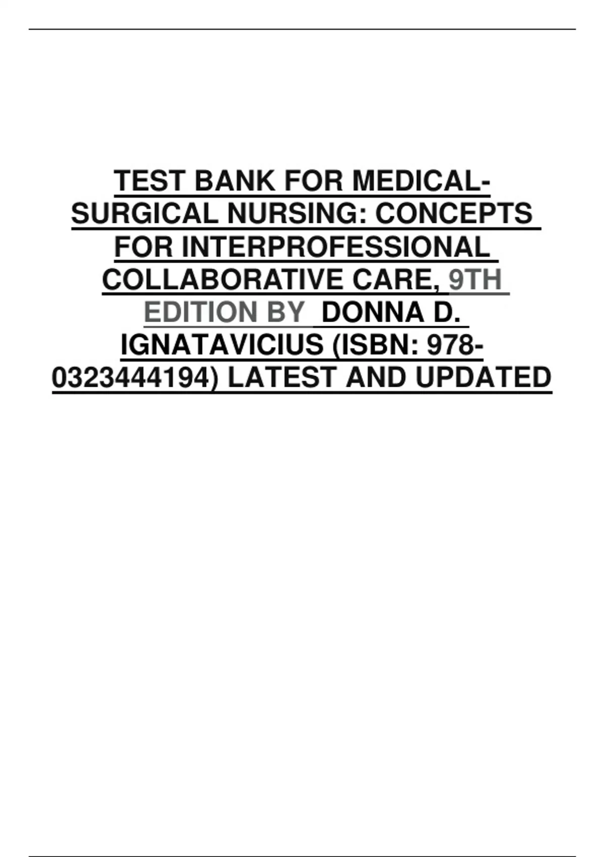 TEST BANK FOR MEDICALSURGICAL NURSING: CONCEPTS FOR INTERPROFESSIONAL COLLABORATIVE CARE, 9TH EDITION BY DONNA D. IGNATAVICIUS (ISBN: 978- 0323444194) LATEST AND UPDATED