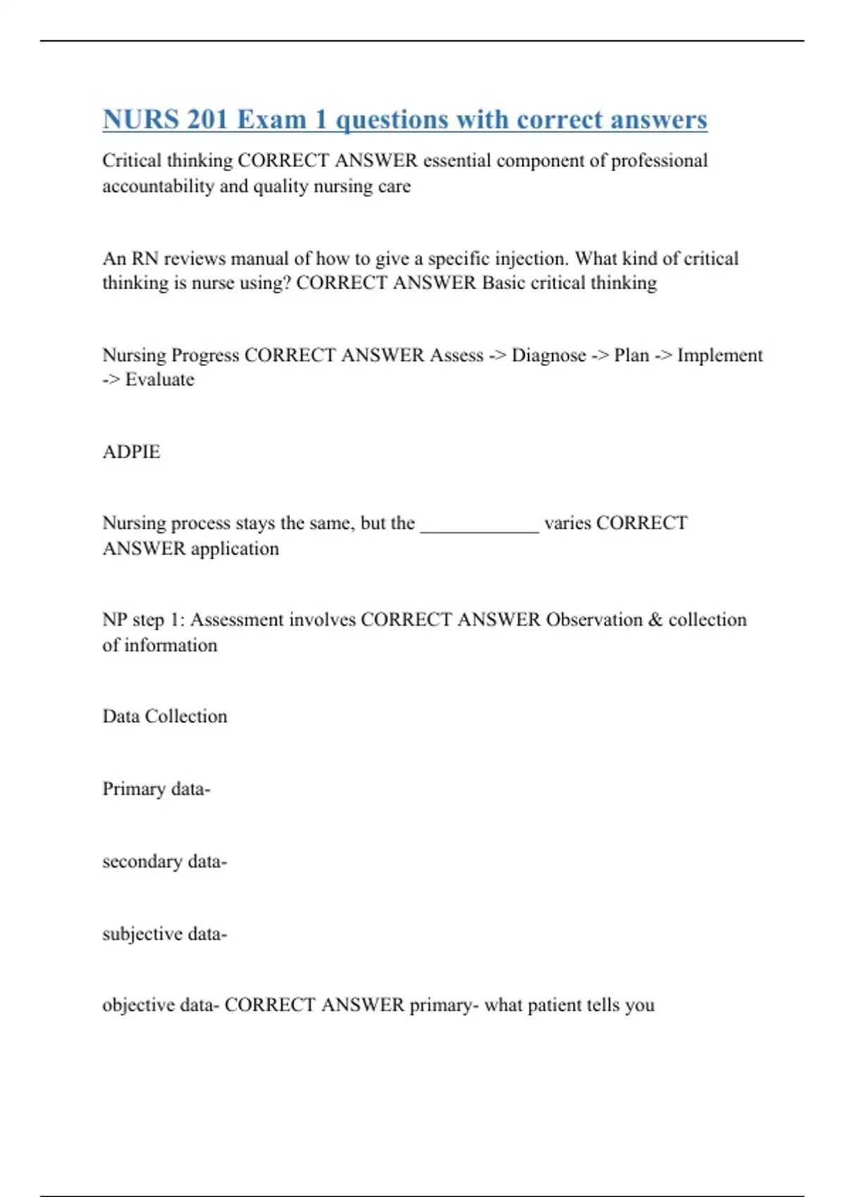 Critical thinking CORRECT ANSWER essential component of professional accountability and quality nursing care An RN reviews manual of how to give a specific injection. What kind of critical thinking is nurse using? CORRECT ANSWER Basic critical thinking Nursing Progress CORRECT ANSWER Assess -> Diagnose -> Plan -> Implement -> Evaluate ADPIE Nursing process stays the same, but the ____________ varies CORRECT ANSWER application NP step 1: Assessment involves CORRECT ANSWER Observation & collection of information Data Collection Primary data- secondary data- subjective data- objective data- CORRECT AN