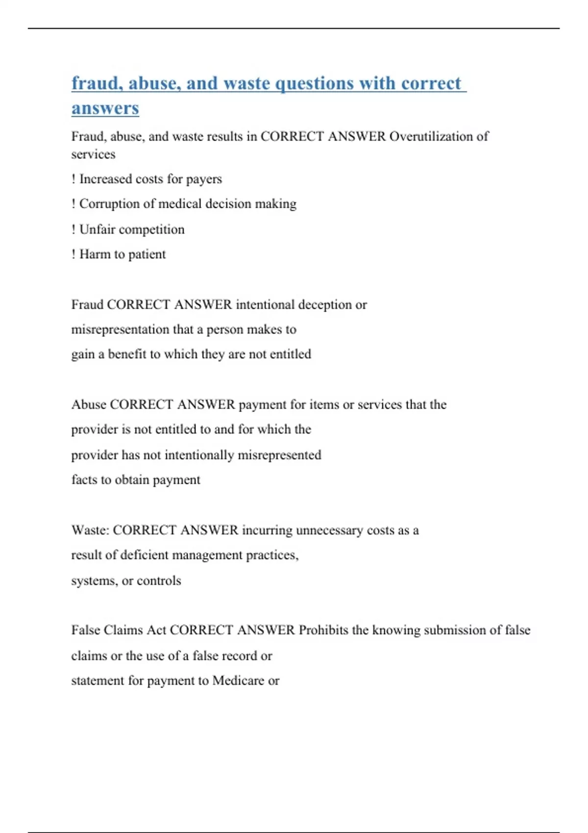 Fraud, abuse, and waste results in CORRECT ANSWER Overutilization of services ! Increased costs for payers ! Corruption of medical decision making ! Unfair competition ! Harm to patient Fraud CORRECT ANSWER intentional deception or misrepresentation that a person makes to gain a benefit to which they are not entitled Abuse CORRECT ANSWER payment for items or services that the provider is not entitled to and for which the provider has not intentionally misrepresented facts to obtain payment Waste: CORRECT ANSWER incurring unnecessary costs as a result of deficient management practices, systems, or controls False Claims Act CORRECT ANSWER Prohibits the knowing submission of false claims or the use of a false record or statement for payment to Medicare or