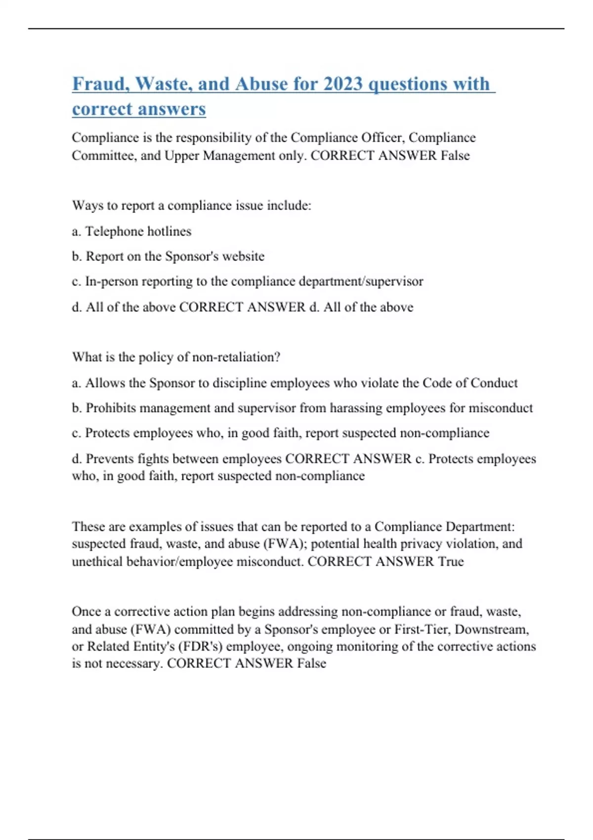 Compliance is the responsibility of the Compliance Officer, Compliance Committee, and Upper Management only. CORRECT ANSWER False Ways to report a compliance issue include: a. Telephone hotlines b. Report on the Sponsor's website c. In-person reporting to the compliance department/supervisor d. All of the above CORRECT ANSWER d. All of the above What is the policy of non-retaliation? a. Allows the Sponsor to discipline employees who violate the Code of Conduct b. Prohibits management and supervisor from harassing employees for misconduct c. Protects employees who, in good faith, report suspected non-compliance d. Prevents fights between employees CORRECT ANSWER c. Protects employees who, in good faith, report suspected non-compliance These are examples of issues that can be reported to a Compliance Department: suspected fraud, waste, and abuse (FWA); potential health privacy violation, and unethical behavior/employee misconduct. CORRECT ANSWER True Once a corrective action plan begins addressing non-compliance or fraud, waste, and abuse (FWA) committed by a Sponsor's employee or First-Tier, Downstream, or Related Entity's (FDR's) employee, ongoing monitoring of the corrective actions is not necessary. CORRECT ANSWER False
