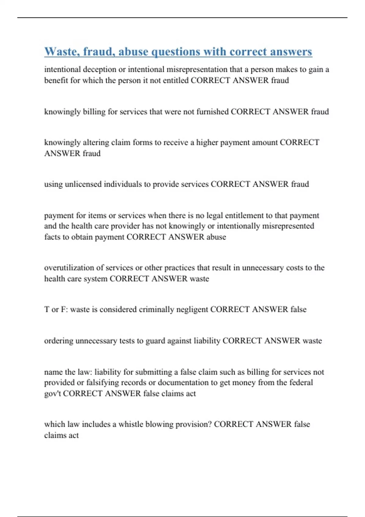 intentional deception or intentional misrepresentation that a person makes to gain a benefit for which the person it not entitled CORRECT ANSWER fraud knowingly billing for services that were not furnished CORRECT ANSWER fraud knowingly altering claim forms to receive a higher payment amount CORRECT ANSWER fraud using unlicensed individuals to provide services CORRECT ANSWER fraud payment for items or services when there is no legal entitlement to that payment and the health care provider has not knowingly or intentionally misrepresented facts to obtain payment CORRECT ANSWER abuse overutilization of services or other practices that result in unnecessary costs to the health care system CORRECT ANSWER waste T or F: waste is considered criminally negligent CORRECT ANSWER false ordering unnecessary tests to guard against liability CORRECT ANSWER waste name the law: liability for submitting a false claim such as billing for services not provided or falsifying records or documentation to get money from the federal gov't CORRECT ANSWER false claims act which law includes a whistle blowing provision?
