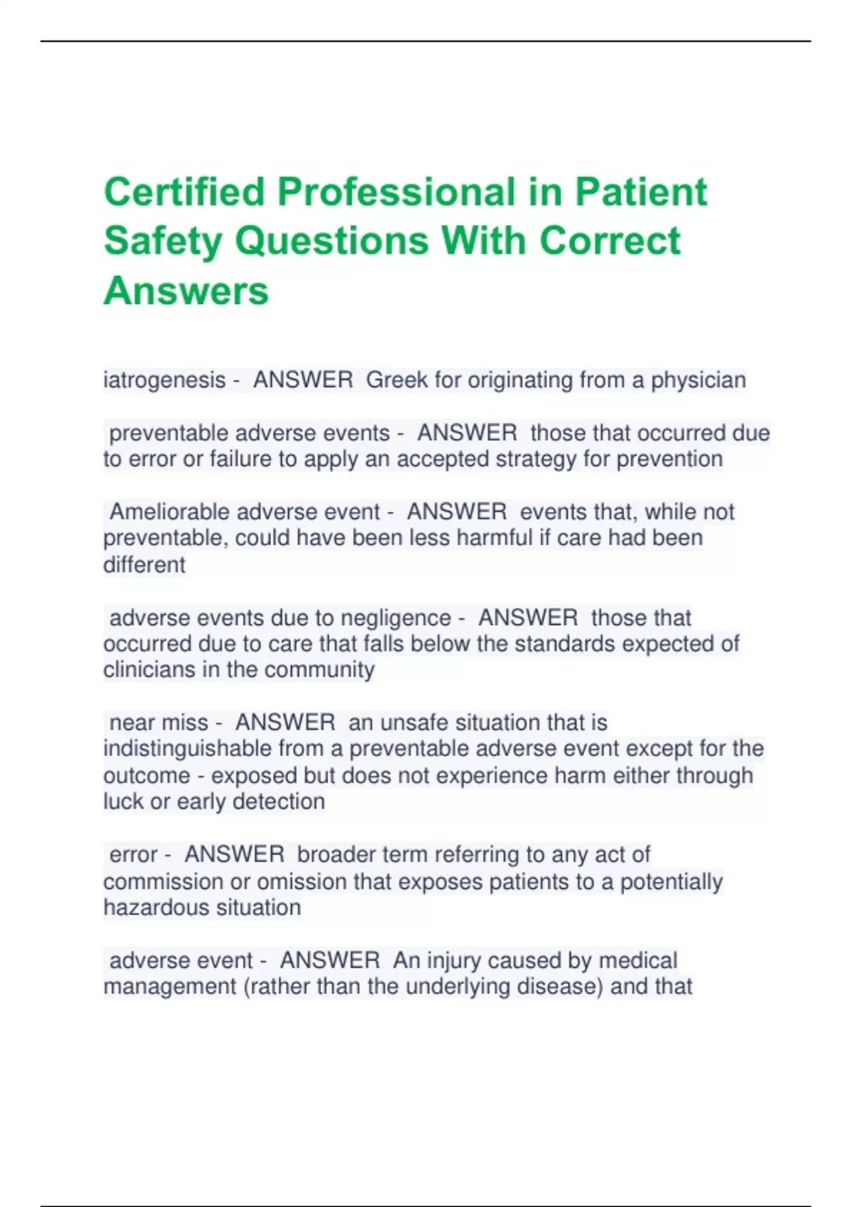 Certified Professional in Patient Safety Questions With Correct Answers iatrogenesis - ANSWER Greek for originating from a physician preventable adverse events - ANSWER those that occurred due to error or failure to apply an accepted strategy for prevention Ameliorable adverse event - ANSWER events that, while not preventable, could have been less harmful if care had been different adverse events due to negligence - ANSWER those that occurred due to care that falls below the standards expected of clinicians in the community near miss - ANSWER an unsafe situation that is indistinguishable from a preventable adverse event except for the outcome - exposed but does not experience harm either through luck or early detection error - ANSWER broader term referring to any act of commission or omission that exposes patients to a potentially hazardous situation adverse event - ANSWER An injury caused by medical management (rather than the underlying disease) and that prolonged the hospitalization, produced at disability at the time of discharge, or both commision - ANSWER doing something wrong omission - ANSWER failing to do the right thing CPOE - ANSWER Computerized Provider Order Entry 2009 HITECH Act and meaningful use program computer alerts three main findings - ANSWER 1. modestly effective at best 2. alert fatigue is common 3. fatigue increases with exposure and heavier use of CPOE systems minimize alert fatigue - ANSWER 1. increase alert specificity to reduce inconsequential alerts 2. tier alerts according to severity 3. make only high level/severe alerts interruptive 4. use human factors principles three concepts that influence safety in ambulatory care - ANSWER 1. role of pt and caregiver behaviors 2. role of provider-pt interactions 3. role of community and health system Medical Office Survey on Pt Safety Culture - ANSWER designed to assess safety culture in amb care and data is available from AHRQ Pt Engagement - ANSWER 1. ed pt about their illness and medications with pt demonstrating understanding "teach back" 2. empowering to act as a safety double check checklist - ANSWER Algorithmic listing of actions to be performed for a given clinical procedure designed to ensure that no matter how often performed by a given clinician, no step will be forgotten reduce risk of slips consensus of required behaviors slips - ANSWER failure of schematic (autopilot) behaviors lapses in concentration, distractions, or fatigue mistake - ANSWER failures in attentional behavior lack of experience or insufficient training Situational Awareness - ANSWER the ability to access and track relevant to the task, comprehend the data, forecast what may happened based on the data, and formulate an appropriate p