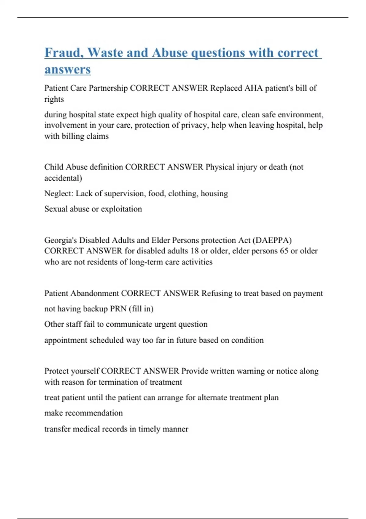 Patient Care Partnership CORRECT ANSWER Replaced AHA patient's bill of rights during hospital state expect high quality of hospital care, clean safe environment, involvement in your care, protection of privacy, help when leaving hospital, help with billing claims Child Abuse definition CORRECT ANSWER Physical injury or death (not accidental) Neglect: Lack of supervision, food, clothing, housing Sexual abuse or exploitation Georgia's Disabled Adults and Elder Persons protection Act (DAEPPA) CORRECT ANSWER for disabled adults 18 or older, elder persons 65 or older who are not residents of long-term care activities Patient Abandonment CORRECT ANSWER Refusing to treat based on payment not having backup PRN (fill in) Other staff fail to communicate urgent question appointment scheduled way too far in future based on condition Protect yourself CORRECT ANSWER