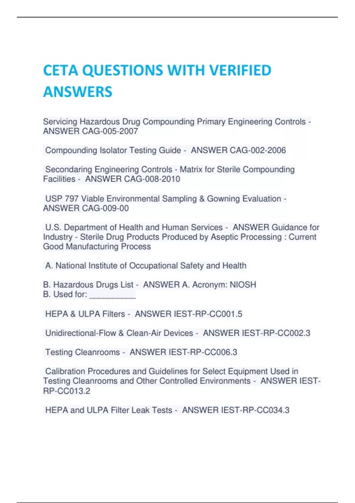 CETA QUESTIONS WITH VERIFIED ANSWERS Servicing Hazardous Drug Compounding Primary Engineering Controls - ANSWER CAG-005-2007 Compounding Isolator Testing Guide - ANSWER CAG-002-2006 Secondaring Engineering Controls - Matrix for Sterile Compounding Facilities - ANSWER CAG-008-2010 USP 797 Viable Environmental Sampling & Gowning Evaluation - ANSWER CAG-009-00 U.S. Department of Health and Human Services - ANSWER Guidance for Industry - Sterile Drug Products Produced by Aseptic Processing : Current Good Manufacturing Process A. National Institute of Occupational Safety and Health B. Hazardous Drugs List - ANSWER A. Acronym: NIOSH B. Used for: __________ HEPA & ULPA Filters - ANSWER IEST-RP-CC001.5 Unidirectional-Flow & Clean-Air Devices - ANSWER IEST-RP-CC002.3 Testing Cleanrooms - ANSWER IEST-RP-CC006.3 Calibration Procedures and Guidelines for Select Equipment Used in Testing Cleanrooms and Other Controlled Environments - ANSWER IESTRP-CC013.2 HEPA and ULPA Filter Leak Tests - ANSWER IEST-RP-CC034.3 Cleanroom and Associated Controlled Environments - Classification of Air Cleanliness by Particle Concentration - ANSWER ISO 14644-1 Cleanroom and Associated Controlled Environments - Monitoring to Provide Evidence of Cleanroom Performance Related to Air Cleanliness by Particle Concentration - ANSWER ISO 14644-2 Cleanroom and Associated Controlled Environments - Test Methods - ANSWER ISO 14644-3 Cleanroom and Associated Controlled Environments - Design, Construction and Start-up - ANSWER ISO 14644-4 International Organization of Standards - ANSWER ISO Controlled Environment Testing Association - ANSWER CETA Certification Application Guide - ANSWER CAG Institute of Environmental Sciences and Technology - ANSWER IEST United States Pharmacopeia - ANSWER USP Food and Drug Administration - ANSWER FDA High Efficiency Particulate Air - ANSWER HEPA Primary Engineering Control - ANSWER PEC Direct Compounding Area - ANSWER DCA Standard Operating Procedure - ANSWER SOP Laminar Air Flow Workbench - ANSWER LAFW Colony-forming Unit(s) - ANSWER cfu Beyond-Use Date - ANSWER BUD Air Changes per Hour - ANSWER ACPH Biological Safety Cabinet - ANSWER BSC Trypticase Soy Argar - ANSWER TSA Feet per Minute - ANSWER FPM Cubit Feet per Minute - ANSWER CFM Micro-Grams per Liter - ANSWER ug/L Micron - ANSWER µm Decibel - ANSWER dB Differential Pressure - ANSWER DP Compounding Aseptic Containment Isolator - ANSWER CACI Compounding Aseptic Isolator - ANSWER CAI Occupational Safety and Health Admi