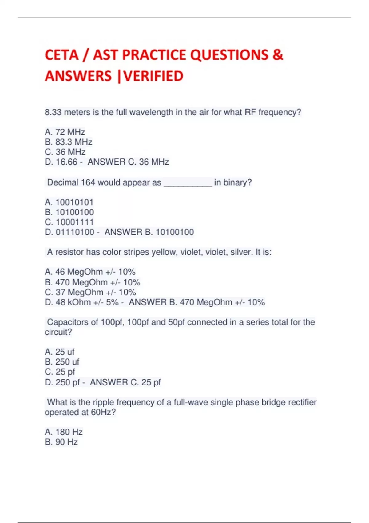 CETA / AST PRACTICE QUESTIONS & ANSWERS |VERIFIED 8.33 meters is the full wavelength in the air for what RF frequency? A. 72 MHz B. 83.3 MHz C. 36 MHz D. 16.66 - ANSWER C. 36 MHz Decimal 164 would appear as __________ in binary? A. B. C. D. - ANSWER B. A resistor has color stripes yellow, violet, violet, silver. It is: A. 46 MegOhm +/- 10% B. 470 MegOhm +/- 10% C. 37 MegOhm +/- 10% D. 48 kOhm +/- 5% - ANSWER B. 470 MegOhm +/- 10% Capacitors of 100pf, 100pf and 50pf connected in a series total for the circuit? A. 25 uf B. 250 uf C. 25 pf D. 250 pf - ANSWER C. 25 pf What is the ripple frequency of a full-wave single phase bridge rectifier operated at 60Hz? A. 180 Hz B. 90 Hz C. 360 Hz D. 120 Hz - ANSWER D. 120 Hz When heated or cooled, a __________ emits a voltage. A. Thermocouple B. Therometer C. Thermostat D. Thermocline - ANSWER A. Thermocouple Which wire size is physically largest? A. #8 B. #12 C. #16 D. #24 - ANSWER A. #8 Adding the binary numbers 101011 and 001110 will give you what result? A. 111001 B. 111111 C. 001010 D. 111011 - ANSWER A. 111001 A component that reduces in resistance as it is heated: A. Is a negative temperature coefficient thermistor B. Is a positive temperature coefficient thermistor C. Is a varactor D. Is a thermocouple - ANSWER A. Is a negative temperature coefficient thermistor An autotransformer: A. Has the secondary unattached to the primary B. Has a single winding C. Uses a core winding D. Uses a buck-boost coil - ANSWER B. Has a single winding A dual trace oscilloscope differs from a single trace in that only the dual trace scope: A. Has two cathode ray guns B. Has Z input C. Alternates sweeps D. Has intensified traces - ANSWER C. Alternates sweeps If an RF signal voltage is reduced by 6 dB, it is then: A. 25% less B. Half the original size C. 75% less D. Not the changed in voltage level - ANSWER B. Half the original size Applying positive volt
