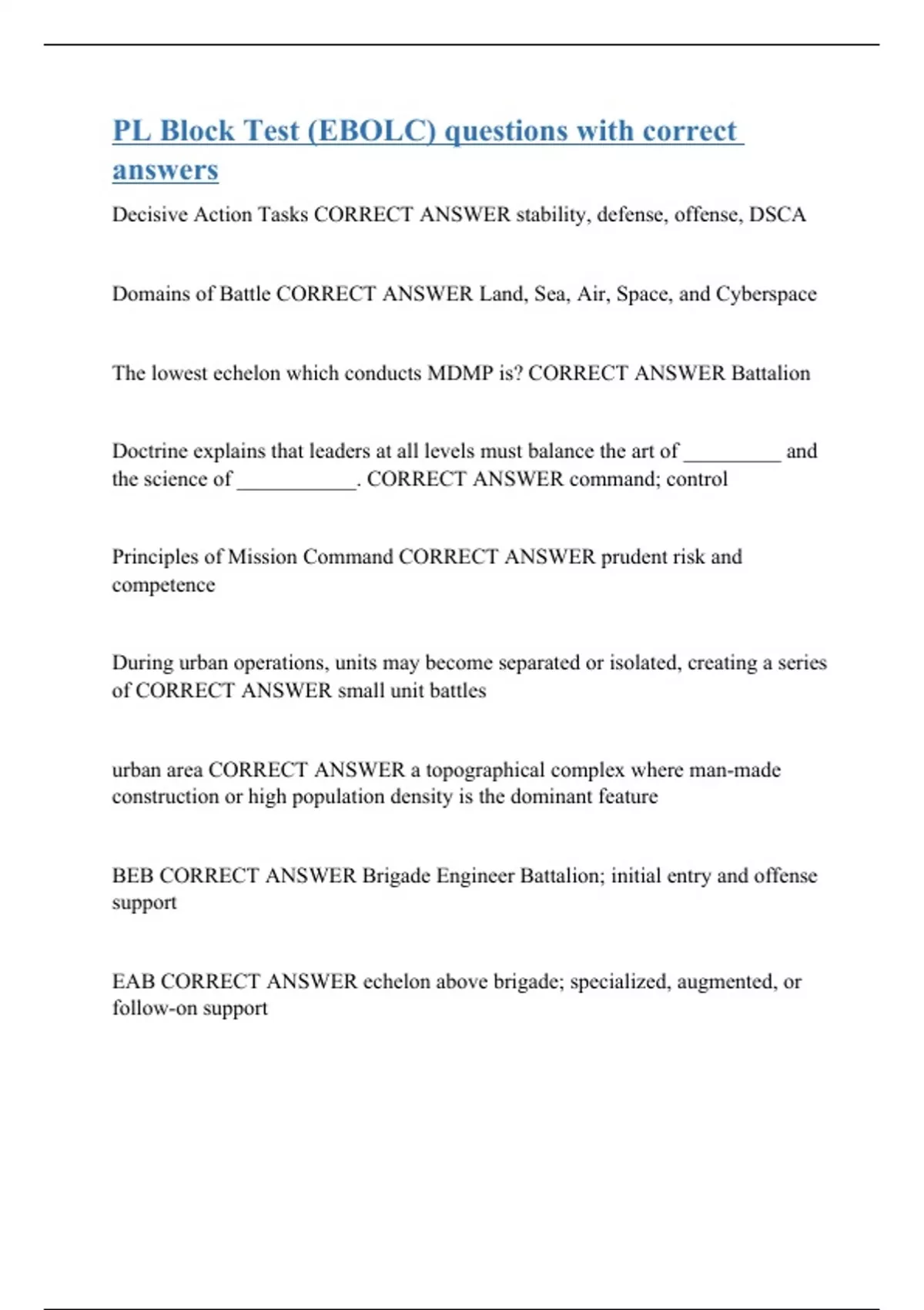 Decisive Action Tasks CORRECT ANSWER stability, defense, offense, DSCA Domains of Battle CORRECT ANSWER Land, Sea, Air, Space, and Cyberspace The lowest echelon which conducts MDMP is? CORRECT ANSWER Battalion Doctrine explains that leaders at all levels must balance the art of _________ and the science of ___________. CORRECT ANSWER command; control Principles of Mission Command CORRECT ANSWER prudent risk and competence During urban operations, units may become separated or isolated, creating a series of CORRECT ANSWER small unit battles urban area CORRECT ANSWER a topographical complex where man-made construction or high population density is the dominant feature BEB CORRECT ANSWER Brigade Engineer Battalion; initial entry and offense support EAB CORRECT ANSWER echelon above brigade; specialized, augmented, or follow-on support