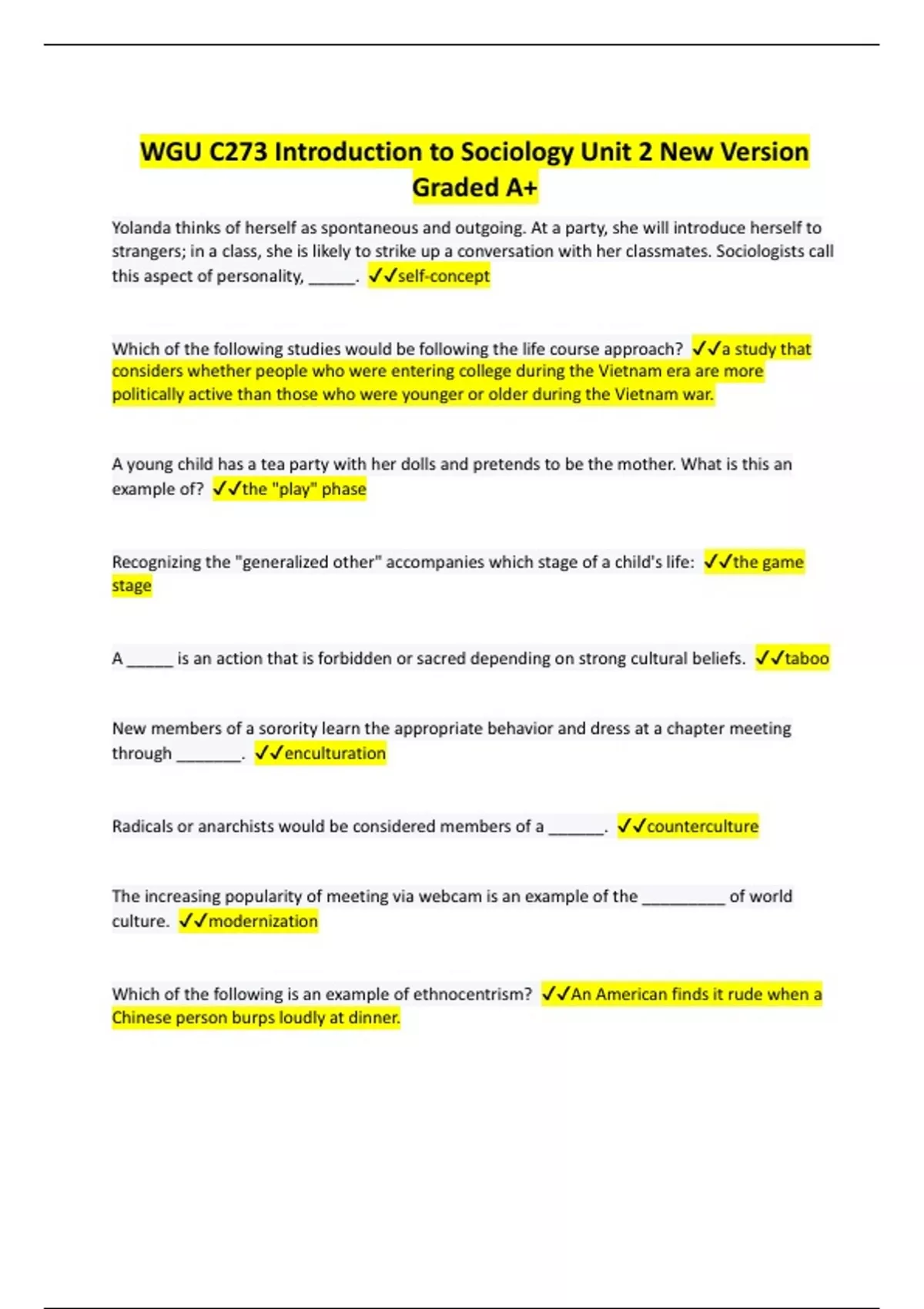WGU C273 Introduction to Sociology Unit 2 Questions and Answers New Version Graded A+