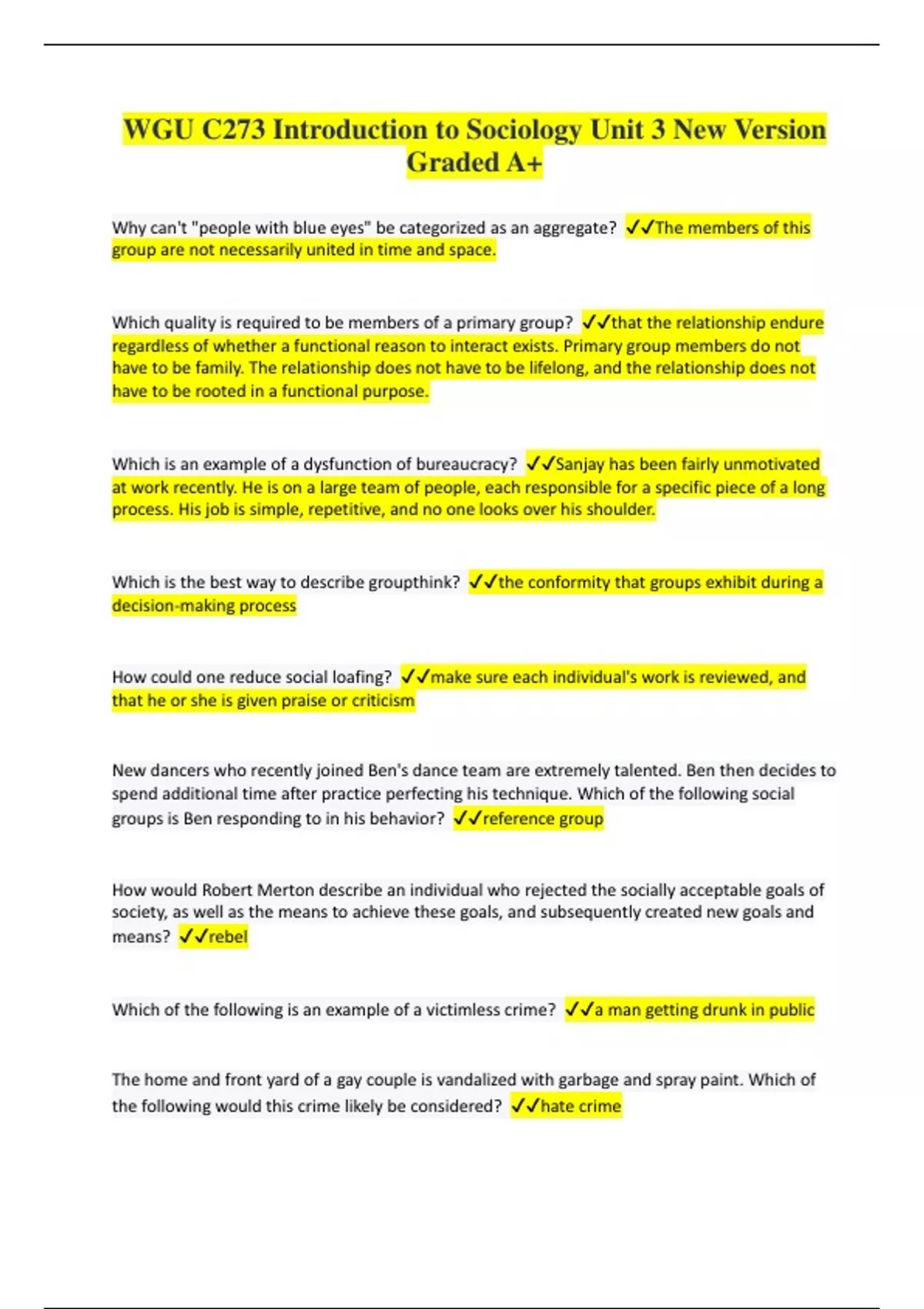 WGU C273 Introduction to Sociology Unit 3 Questions and Answers New Version Graded A+