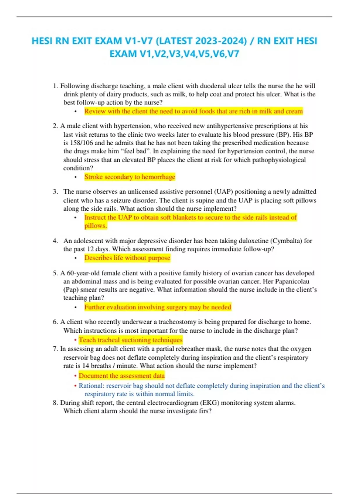 HESI RN EXIT EXAM V1-V7 (LATEST ) / RN EXIT HESI EXAM V1,V2,V3,V4,V5,V6,V7 1. Following discharge teaching, a male client with duodenal ulcer tells the nurse the he will drink plenty of dairy products, such as milk, to help coat and protect his ulcer. What is the best follow-up action by the nurse? • Review with the client the need to avoid foods that are rich in milk and cream 2. A male client with hypertension, who received new antihypertensive prescriptions at his last visit returns to the clinic two weeks later to evaluate his blood pressure (BP). His BP is 158/106 and he admits that he has not been taking the prescribed medication because the drugs make him “feel bad”. In explaining the need for hypertension control, the nurse should stress that an elevated BP places the client at risk for which pathophysiological condition? • Stroke secondary to hemorrhage 3. The nurse observes an unlicensed assistive personnel (UAP) positioning a newly admitted client who has a seizure disorder. The client is supine and the UAP is placing soft pillows along the side rails. What action should the nurse implement? • Instruct the UAP to obtain soft blankets to secure to the side rails instead of pillows. 4. An adolescent with major depressive disorder has been taking duloxetine (Cymbalta) for the past 12 days. Which assessment finding requires immediate follow-up? • Describes life without purpose 5. A 60-year-old female client with a positive family history of ovarian cancer has developed an abdominal mass and is being evaluated for possible ovarian cancer. Her Papanicolau (Pap) smear results are negative. What information should the nurse include in the client’s teaching plan? • Further evaluation involving surgery may be needed 6. A client who recently underwear a tracheostomy is being prepared for discharge to home. Which instructions is most important for the nurse to include in the discharge plan? • Teach tracheal suctioning techniques 7. In assessing an adult client with a partial rebreather mask, the nurse notes that the oxygen reservoir bag does not deflate completely during inspiration and the client’s respiratory rate is 14 breaths / minute. What action should the nurse implement? • Document the assessment data • Rational: reservoir bag should not deflate completely during inspiration and the client’s respiratory rate is within normal limits. 8. During shift report, the central electrocardiogram (EKG) monitoring system alarms. Which client alarm should the nurse investigate firs? • Respiratory apnea of 30 seconds 9. During a home visit, the nurse observed an elderly client with diabetes slip and fall. What action should the nurse take first? • Check the client for lacerations or fractures 10. At 0600 while admitting a woman for a schedule repeat cesarean section (C-Section), the client tells the nurse that she drank a cup a coffee at 0400 because she wanted to avoid getting a headache. Which action should the nurse take first? • Inform the anesthesia care provider 11. After placing a stethoscope as seen in the picture, the nurse auscultates S1 and S2 heart sounds. To determine if an S3 heart sound is present, what action should the nurse take first? • Listen with the bell at the same location 12. A 66-year-old woman is retiring and will no longer have a health insurance through her place of employment. Which agency should the client be referred to by the employee health nurse for health insurance needs? • Medicare 13. A client who is taking an oral dose of a tetracycline complains of gastrointestinal upset. What snack should the nurse instruct the client to take with the tetracycline? • Toasted wheat bread and jelly 14. Following a lumbar puncture, a client voices several complaints. What complaint indicated to the nurse that the client is experiencing a complication? • “I have a headache that gets worse when I sit up” • “I am having pain in my lower back when I move my legs” • “My throat hurts when I swallow” • “I feel sick to my stomach and am going to throw up” 15. An elderly client seems confused and reports the onset of nausea, dysuria, and urgency with incontinence. Which action should the nurse implement? • Obtain a clean catch mid-stream specimen 16. The nurse is assisting the mother of a child with phenylketonuria (PKU) to select foods that are in keeping with the child’s dietary restrictions. Which foods are contraindicated for this child? • Foods sweetened with aspartame