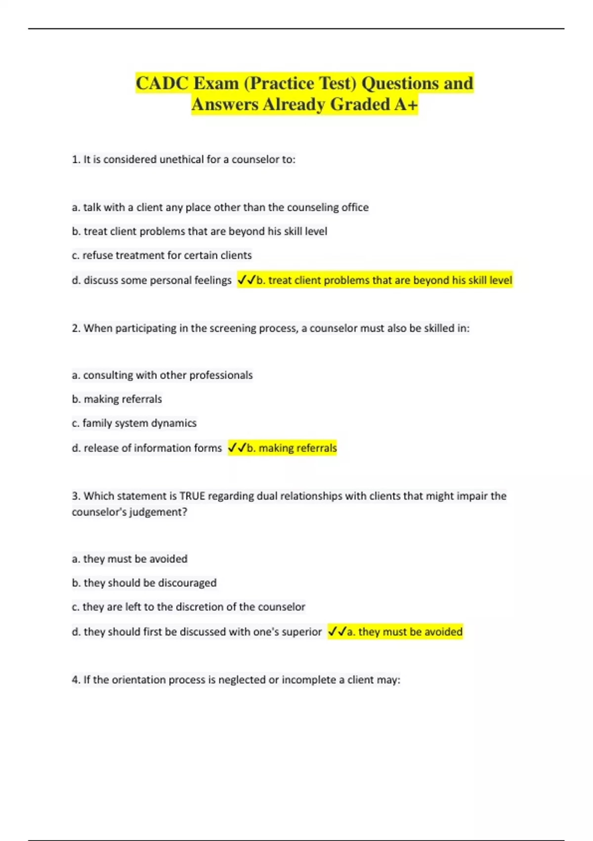 1. It is considered unethical for a counselor to: a. talk with a client any place other than the counseling office b. treat client problems that are beyond his skill level c. refuse treatment for certain clients d. discuss some personal feelings b. treat client problems that are beyond his skill level 2. When participating in the screening process, a counselor must also be skilled in: a. consulting with other professionals b. making referrals c. family system dynamics d. release of information forms b. making referrals
