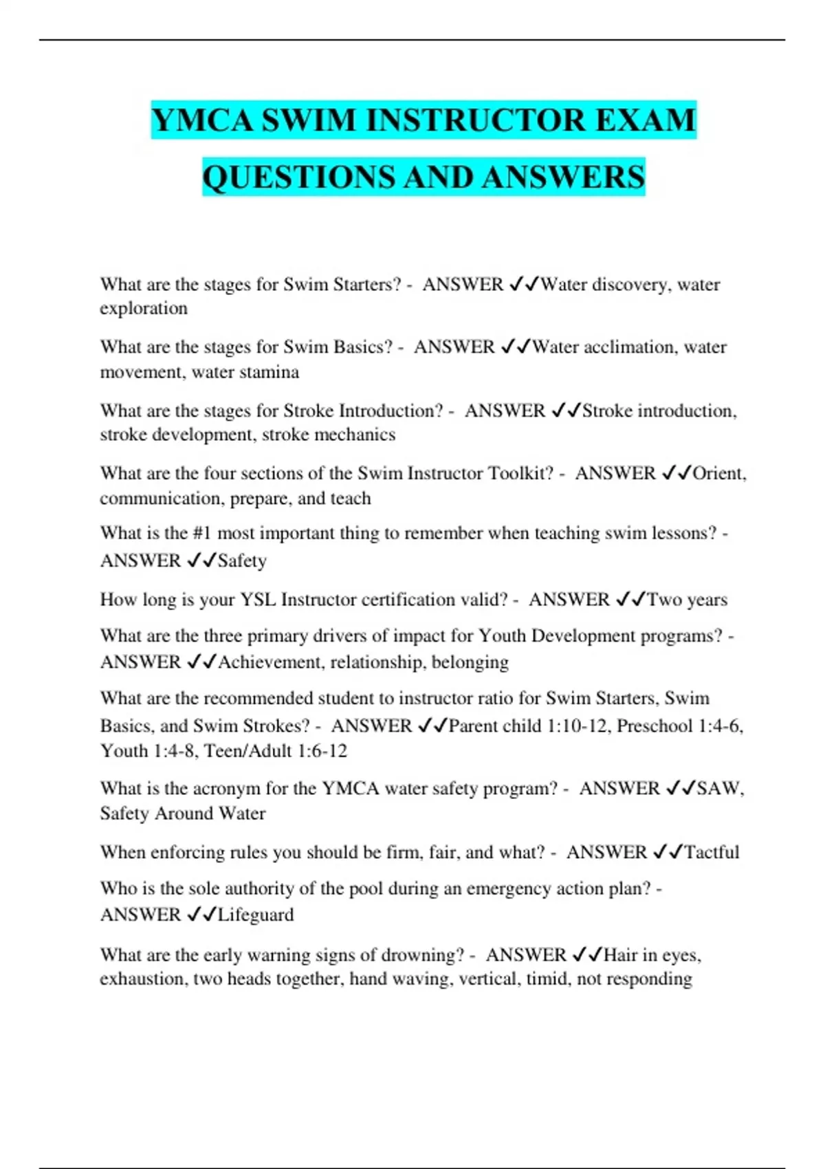 YMCA SWIM INSTRUCTOR EXAM QUESTIONS AND ANSWERS What are the stages for Swim Starters? - ANSWER ️️ Water discovery, water exploration What are the stages for Swim Basics? - ANSWER ️️ Water acclimation, water movement, water stamina What are the stages for Stroke Introduction? - ANSWER ️️ Stroke introduction, stroke development, stroke mechanics What are the four sections of the Swim Instructor Toolkit? - ANSWER ️️ Orient, communication, prepare, and teach What is the #1 most important thing to remember when teaching swim lessons? - ANSWER ️️ Safety How long is your YSL Instructor certification valid? - ANSWER ️️ Two years What are the three primary drivers of impact for Youth Development programs? - ANSWER ️️ Achievement, relationship, belonging What are the recommended student to instructor ratio for Swim Starters, Swim Basics, and Swim Strokes? - ANSWER ️️ Parent child 1:10-12, Preschool 1:4-6, Youth 1:4-8, Teen/Adult 1:6-12