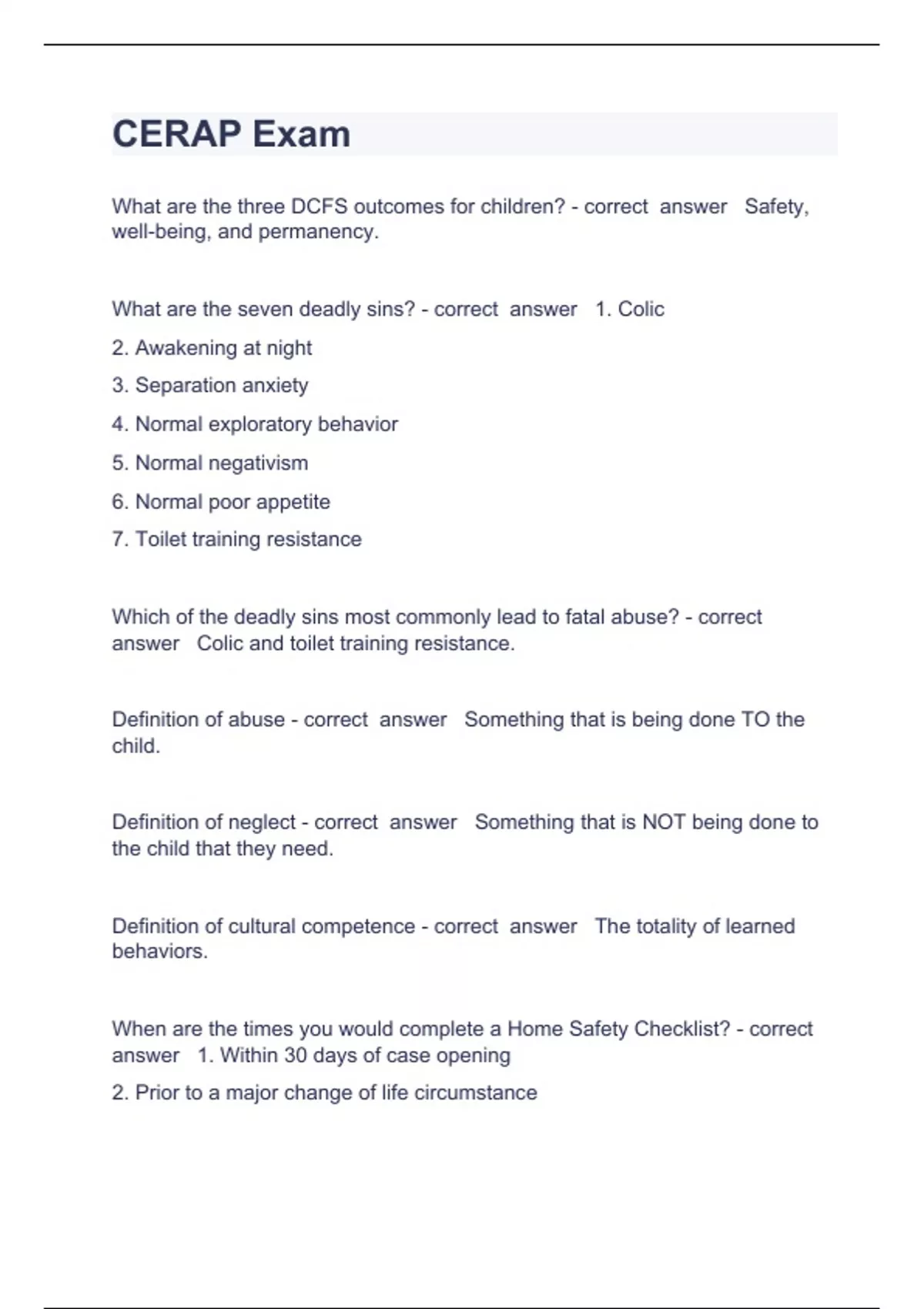 CERAP Exam Questions with complete solution 2023/2024What are the three DCFS outcomes for children? - correct answer Safety, well-being, and permanency. What are the seven deadly sins? - correct answer 1. Colic 2. Awakening at night 3. Separation anxiety 4. Normal exploratory behavior 5. Normal negativism 6. Normal poor appetite 7. Toilet train