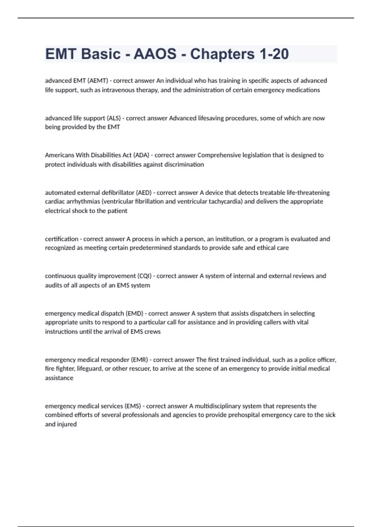 EMT Basic - AAOS - Chapters 1-20 Question and answers 100% correct 2023/2024advanced EMT (AEMT) - correct answer An individual who has training in specific aspects of advanced life support, such as intravenous therapy, and the administration of certain emergency medications advanced life support (ALS) - correct answer Advanced lifesaving procedures, some of which are now being provided by the EMT Americans With Disabilities Act (ADA) - correct answer Comprehensive legislation that is designed to protect individuals with disabilities against discrimination automated external defibrillator (AED) - correct answer A device that detects treatable life-threatening cardiac arrhythmias (ventricular fibrillation and ventricular tachycardia) and delivers the appropriate electrical shock to the pa