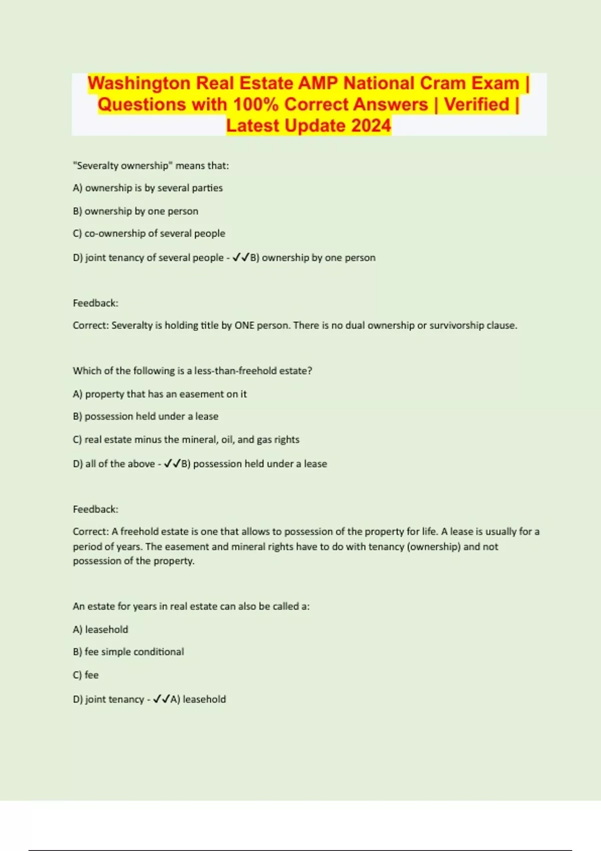 Washington Real Estate AMP National Cram Exam | Questions with 100% Correct Answers | Verified | Latest Update 2024 | 33 Pages