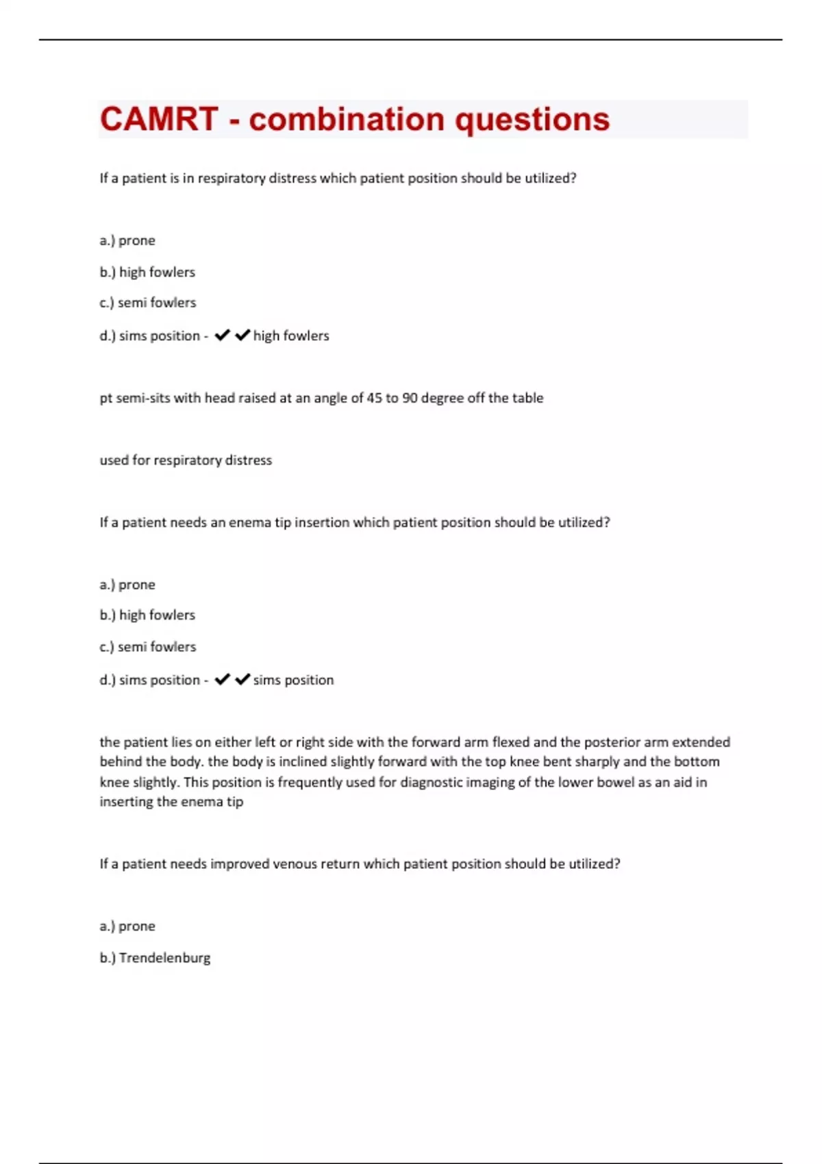 If a patient is in respiratory distress which patient position should be utilized? a.) prone b.) high fowlers c.) semi fowlers d.) sims position - high fowlers pt semi-sits with head raised at an angle of 45 to 90 degree off the table used for respiratory distress If a patient needs an enema tip insertion which patient position should be utilized? a.) prone b.) high fowlers c.) semi fowlers d.) sims position - sims position the patient lies on either left or right side with the forward arm flexed and the posterior arm extended behind the body. the body is inclined slightly forward with the top knee bent sharply and the bottom knee slightly. This position is frequently used for diagnostic imaging of the lower bowel as an aid in inserting the enema tip If a patient needs improved venous return which patient position should be utilized? a.) prone b.) Trendelenburgc.) semi fowlers d.) sims position - Patients head is lower than the rest of their body used for promotion of venous return in patients with inadequate peripheral perfusion caused by disease What positions must a person with COPD avoid? from the list identify all that apply: -prone -trendelenburg -semi fowlers -sims position -high fowlers -supine - prone supine sims position a patient has been lying in a urine-soaked sheet, the skin on their thigh is cold (in pressure areas) and blanching. A small ulcer soon appears. what skin condition should we be concerned about? - skin ischemia ERCP stands for...? - endoscopic retrograde cholangiopancreatography Orthostatic hypotension is? - hypotension caused by a sudden loss of bp when a person stands up suddenly Purpose of lateral bending for scoliosis views? - when the patient preforms lateral bending the compensatory curve will straighten outPurpose and position of a CVP line? - Used for measuring central venous pressure as well as allowing nutrients and fluid to be instilled; best location would be brachiocephalic vein at the junction of the SVC or actually within the SVC itself Purpose and position of a Swan-Ganz catheter? - pulmonary artery catheter Purpose = 1. to measure wedge pressure (pulmonary artery pressure) 2. to measure central venous pressure (right atrial pressure) 3. to measure systolic, diastolic and mean pressure 4. to withdraw blood samples 5. to give fluid or inject drugs Location = right or left pulmonary artery What does plia circularis mean? - The numerous folds of the mucous membrane of the small intestine, running transversely for about two-thirds of the circumference of the gut How do you know if a FB is in the oesophagus and not the trachea? - If a FB is in the trachea, the lung(s) will still have air in them on the expiration radiograph of the chest, whereas a FB in the oesophagus will have no effect on the lung size / markings What breathing should be used when x-raying a soft-tissue neck? - slow inspiration to show air in the trachea On an oblique lumbar spine what is the "neck" of the Scotty Dog? - par interarticularis Why use an anticholinergic? - reduces stomach/GI motility used for GI studies How is a question of imperforate anus radiographed? - I. Infant is held upside down by heels for 5 minutes to allow swallowed air to rise to level of closure (probably not done this way anymore??! Lol)II. Films are taken 6-24 hours after birth (allows time for air to reach rectum) III. Film at 72" SID - minimizes distortion IV. AP and Lateral views are taken while upside-down, radiopaque marker placed at anal opening V. Distance can be measured on the radiograph What does the right lateral stomach demonstrate? - Shows the anterior and posterior aspects of the stomach, the pyloric canal, and the duodenal bulb. The right lateral projection commonly affords the best image of the pyloric canal and the duodenal bulb in patients with a hypersthenic habitus