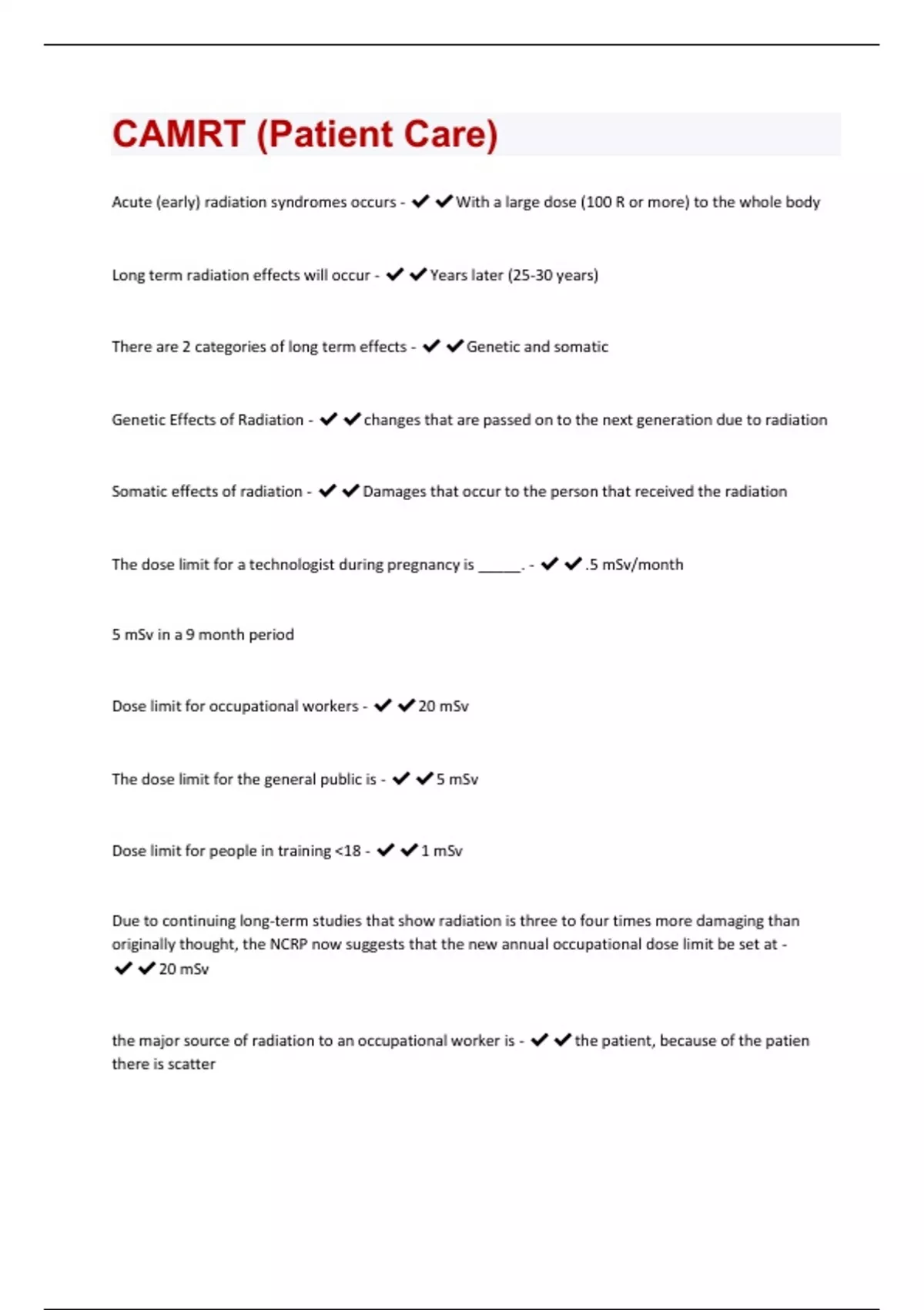 Acute (early) radiation syndromes occurs - With a large dose (100 R or more) to the whole body Long term radiation effects will occur - Years later (25-30 years) There are 2 categories of long term effects - Genetic and somatic Genetic Effects of Radiation - changes that are passed on to the next generation due to radiation Somatic effects of radiation - Damages that occur to the person that received the radiation The dose limit for a technologist during pregnancy is _____. - .5 mSv/month 5 mSv in a 9 month period Dose limit for occupational workers - 20 mSv The dose limit for the general public is - 5 mSv Dose limit for people in training 18 - 1 mSv Due to continuing long-term studies that show radiation is three to four times more damaging than originally thought, the NCRP now suggests that the new annual occupational dose limit be set at - 20 mSv the major source of radiation to an occupational worker is - the patient, because of the patien there is scatterlead shields should be no less than what thickness - 0.25mm lead shields of 0.25mm thickness will absorb - 97% of all radiation below 50kv 66% of a 75kv beam 51% of a 100kv beam lead shields of 0.5mm thickness with absorb - 99% of a beam below 50kv 88% of a 75kv beam 75% of a 100kv beam patients can be protected by 2/3 ALARA concepts which are - time and shielding distance is the other but that does not apply as the patient has to be in the primary field of view 2 other concepts to protect a patient is - communication and collimation autonomy - the right of all persons to make a decisions free from external pressure beneficence - doing good double effect - a situation in which an action has both a positive effect and a negative effect ex. xrays fidelity - keeping promises justice - all treated equalnonmaleficence - do no harm and prevent harm paternalism - A policy of treating subject people as if they were children, providing for their needs but not giving them rights