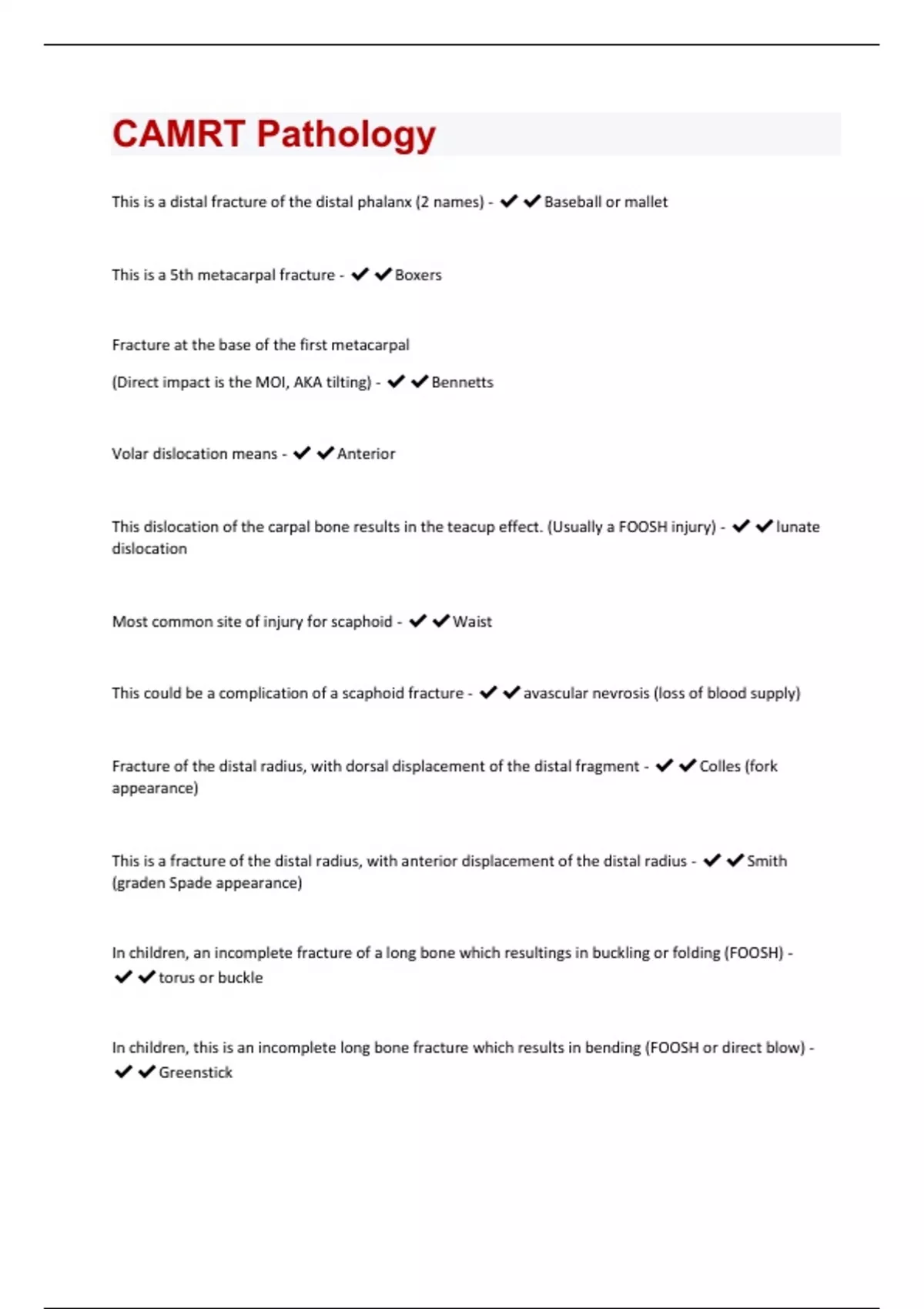 This is a distal fracture of the distal phalanx (2 names) - Baseball or mallet This is a 5th metacarpal fracture - Boxers Fracture at the base of the first metacarpal (Direct impact is the MOI, AKA tilting) - Bennetts Volar dislocation means -Anterior This dislocation of the carpal bone results in the teacup effect. (Usually a FOOSH injury) - lunate dislocation Most common site of injury for scaphoid - Waist This could be a complication of a scaphoid fracture - avascular nevrosis (loss of blood supply) Fracture of the distal radius, with dorsal displacement of the distal fragment - Colles (fork appearance) This is a fracture of the distal radius, with anterior displacement of the distal radius - Smith (graden Spade appearance) In children, an incomplete fracture of a long bone which resultings in buckling or folding (FOOSH) - torus or buckle In children, this is an incomplete long bone fracture which results in bending (FOOSH or direct blow) - GreenstickThis is a fracture in childrening that results in the bowing or curving of the long bone (force applied) - Bow deformity In children an epiphyseal fracture often is known as the fracture - Salter Harris type 3 Fracture of the ulnar shaft that leads to anterior displacement of the radial head (fall on olecranon) - Menteggia These two things are indication of an elbow joint fracture (trauma to elbow joint) - 1. pain 2. Visible fat pad Elbow joint dislocations are usually this directions (fall onto extended elbow) - posterior This is when you fall on a moderately flexed elbow and the triceps muscle separates the fragment from the ulna. - olecranon fracture Most common elbow fracture (FOOSH) - radial head fracture THis shoulder injury occurs when there is extreme arm rotation and abduction - Anterior dislocation of shoulder (The humeral head looks like it is on ribs) This shoulder injury involves axial loading with internal rotation - Posterior dislocation of schoulder (humeral head is quite away from carcass) If the patients foot is rotated internally and shortened it means this hip dislocation - PosteriorIf there is no difference in leg length but the patients foot is externally rotated it means this dislocation - anterior In an anterior dislocation of the hip you will see the femoral head here (force applied downward and forward) - medial and inferior (Almost in the obturator) For the posterior hip dislocation the femoral head is here (Force to flexed Hip-car crash) - Lateral, posterior and superior (ON the ala) This type of hip dislocation the femoral head is forced through the ALA . ( force to adducted hip) - central Fracture just below the femoral head (Trauma to hip) - Subcapital
