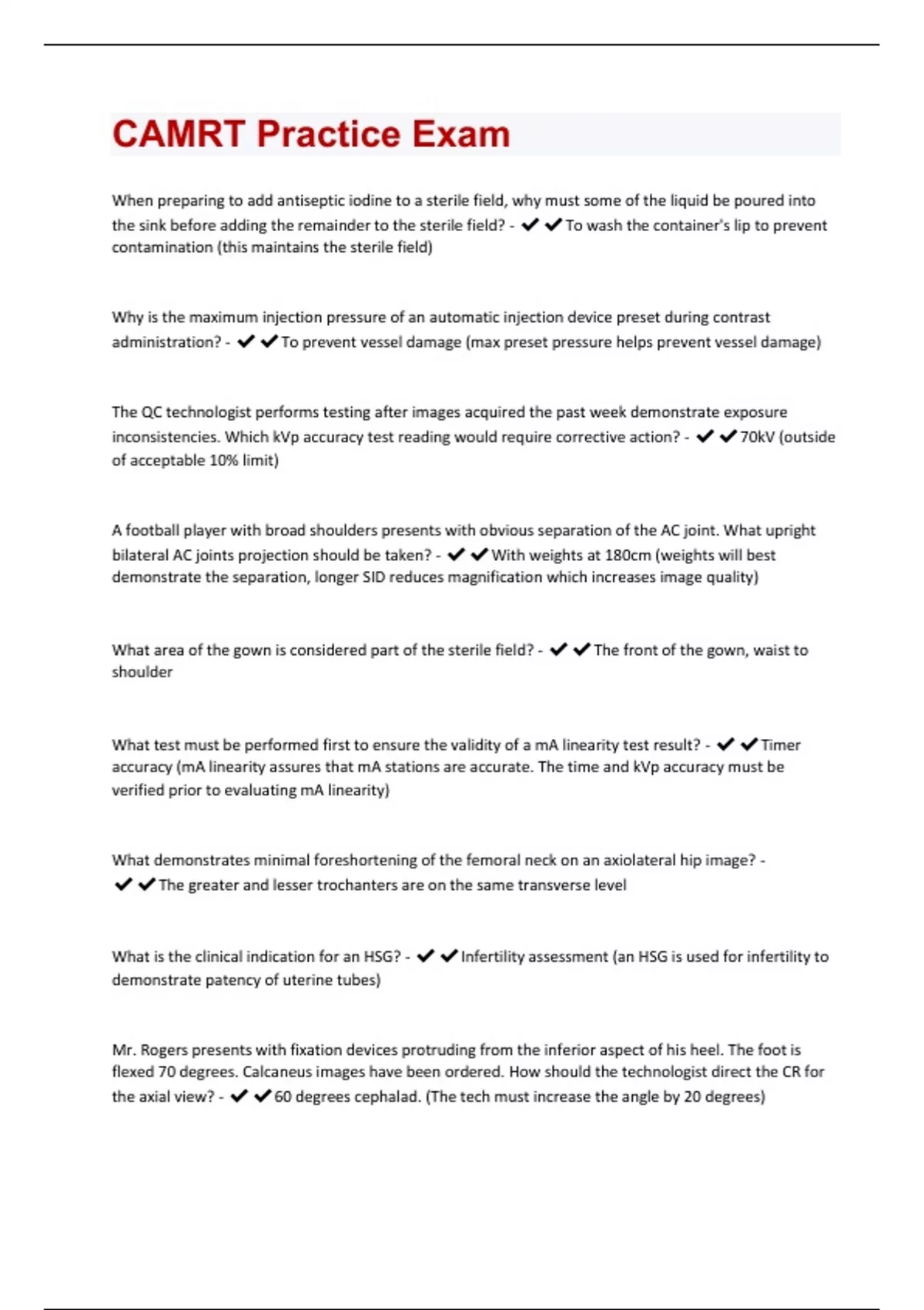When preparing to add antiseptic iodine to a sterile field, why must some of the liquid be poured into the sink before adding the remainder to the sterile field? - To wash the container's lip to prevent contamination (this maintains the sterile field) Why is the maximum injection pressure of an automatic injection device preset during contrast administration? - To prevent vessel damage (max preset pressure helps prevent vessel damage) The QC technologist performs testing after images acquired the past week demonstrate exposure inconsistencies. Which kVp accuracy test reading would require corrective action? - 70kV (outside of acceptable 10% limit) A football player with broad shoulders presents with obvious separation of the AC joint. What upright bilateral AC joints projection should be taken? - With weights at 180cm (weights will best demonstrate the separation, longer SID reduces magnification which increases image quality) What area of the gown is considered part of the sterile field? - The front of the gown, waist to shoulder What test must be performed first to ensure the validity of a mA linearity test result? - Timer accuracy (mA linearity assures that mA stations are accurate. The time and kVp accuracy must be verified prior to evaluating mA linearity) What demonstrates minimal foreshortening of the femoral neck on an axiolateral hip image? - The greater and lesser trochanters are on the same transverse level What is the clinical indication for an HSG? - Infertility assessment (an HSG is used for infertility to demonstrate patency of uterine tubes) Mr. Rogers presents with fixation devices protruding from the inferior aspect of his heel. The foot is flexed 70 degrees. Calcaneus images have been ordered. How should the technologist direct the CR for the axial view? - 60 degrees cephalad. (The tech must increase the angle by 20 degrees)What will best demonstrate any medial/lateral displacement of a fracture of the mandibular ramus? - AP Axial (Towne) (axiolateral oblique and lateral will both show ant/post displacement) Which of the following would demonstrate air/fluid levels in the abdomen on an ICU patient who must remain supine? - Dorsal decubitus (using HB - shows air/fluid levels)