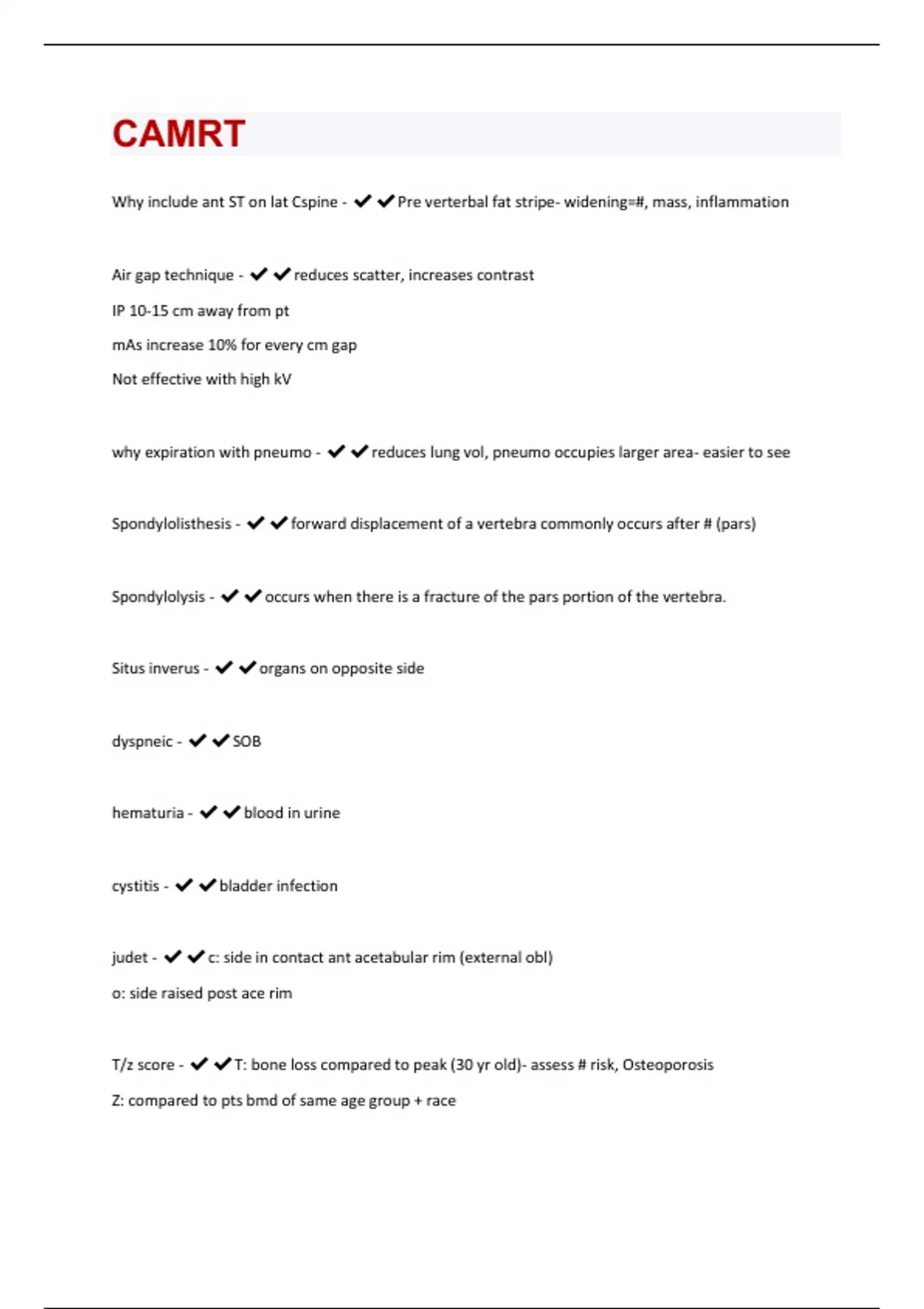 Why include ant ST on lat Cspine - Pre verterbal fat stripe- widening=#, mass, inflammation Air gap technique - reduces scatter, increases contrast IP 10-15 cm away from pt mAs increase 10% for every cm gap Not effective with high kV why expiration with pneumo - reduces lung vol, pneumo occupies larger area- easier to see Spondylolisthesis - forward displacement of a vertebra commonly occurs after # (pars) Spondylolysis - occurs when there is a fracture of the pars portion of the vertebra. Situs inverus - organs on opposite side dyspneic - SOB hematuria - blood in urine cystitis - bladder infection judet - c: side in contact ant acetabular rim (external obl) o: side raised post ace rim T/z score - T: bone loss compared to peak (30 yr old)- assess # risk, Osteoporosis Z: compared to pts bmd of same age group + raceNormal: -1 Osteo: -2.5 AP knee angle - 18 cm and less: 5 caudad 19-24cm: no angle 25cm +: 5 ceph indication of ant hip dislocation - ext rotated foot Outlet/ inlet - oulet: around 25-30 (men) 45 women ceph for rami inlet: 40 caudad for pelvic ring Lat Tspine if pt has big sholders - angle 10-15 ceph Hypovolemic shock - fluid loss 15-25% SS: cold and clammy, thirst, cyanosis What to do: elevate legs( trendelenberg), keep warm Ba Enema tips - insert tube ant + sup hang bag 46cm 18inch 24 hrs prior clear liquid diet Stomach positions - GI position RAO: Ba in duodenal bulb, pyloric canal (also seen in rt lat) LPO: fundus Lat: ant/post stomach, retrogastric space PA: Ba in body and pylorus/ air in fundus AP: Ba filled fundus and duodenum/jejunumBa Enema views - Shisard: PA (30 caud) Rectosigmoid LPO/RAO: hepatic/colic flex, asc colon, sigmoid RPO/LAO: splenic, desc