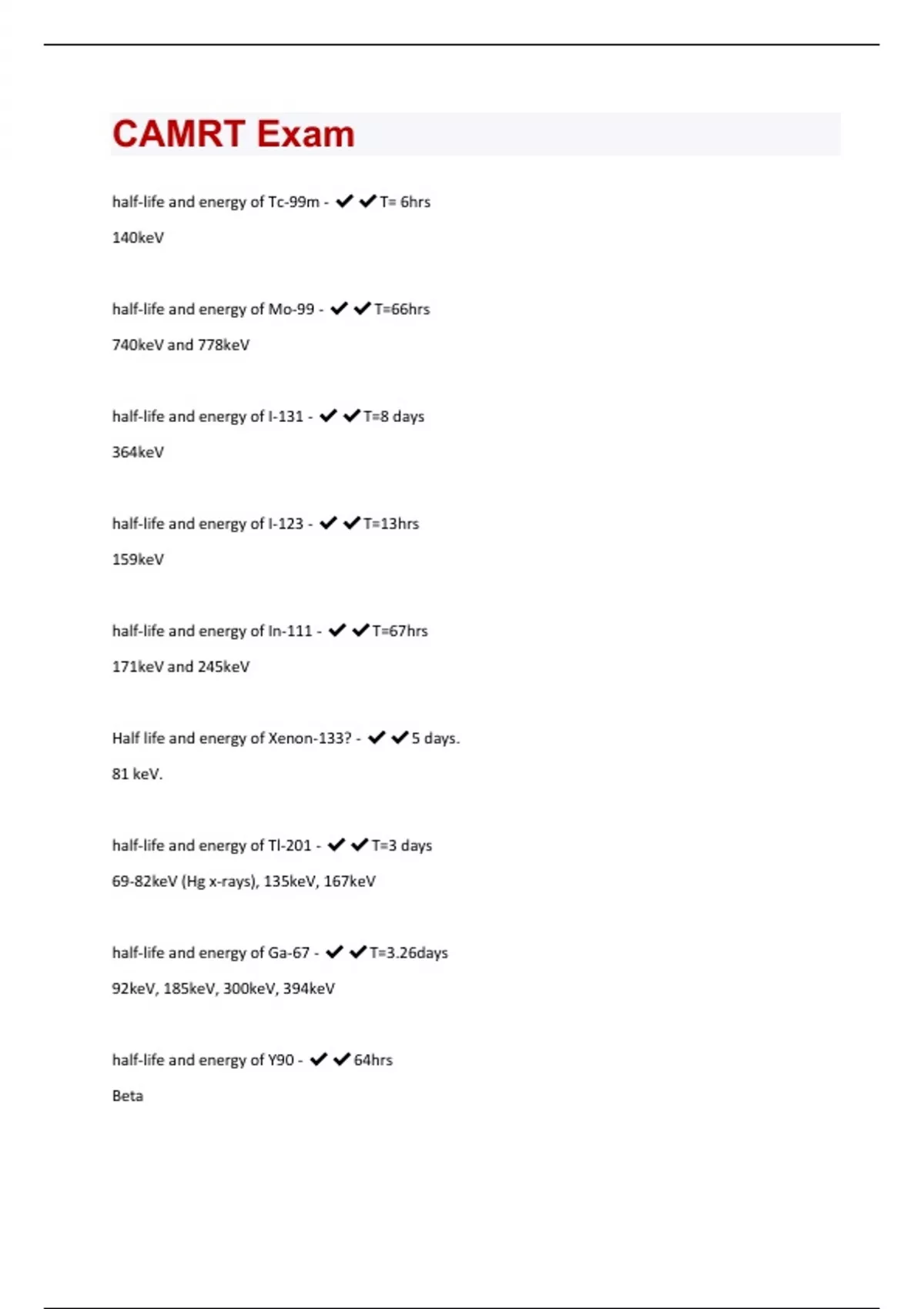 half-life and energy of Tc-99m - T= 6hrs 140keV half-life and energy of Mo-99 - T=66hrs 740keV and 778keV half-life and energy of I-131 - T=8 days 364keV half-life and energy of I-123 - T=13hrs 159keV half-life and energy of In-111 - T=67hrs 171keV and 245keV Half life and energy of Xenon-133? - 5 days. 81 keV. half-life and energy of Tl-201 - T=3 days 69-82keV (Hg x-rays), 135keV, 167keV half-life and energy of Ga-67 - T=3.26days 92keV, 185keV, 300keV, 394keV half-life and energy of Y90 - 64hrs Betahalf-life and energy of 18-F - T=110mins 511keV half-life and energy of C-11 - T=20mins 511 half-life and energy of N-13 - T=10min half-life and energy of O-15 - T=2 min half-life and energy of Ga-68 - 68mins half-life and energy of Rb-82 - 76sec half-life and energy of Cs-137 - 30years 662keV half-life and energy of Co-57 - 272days 122keV and 136keV 1mCi = ? Bq - 37MBq 100 REM = __________ Sv - 1 Sv