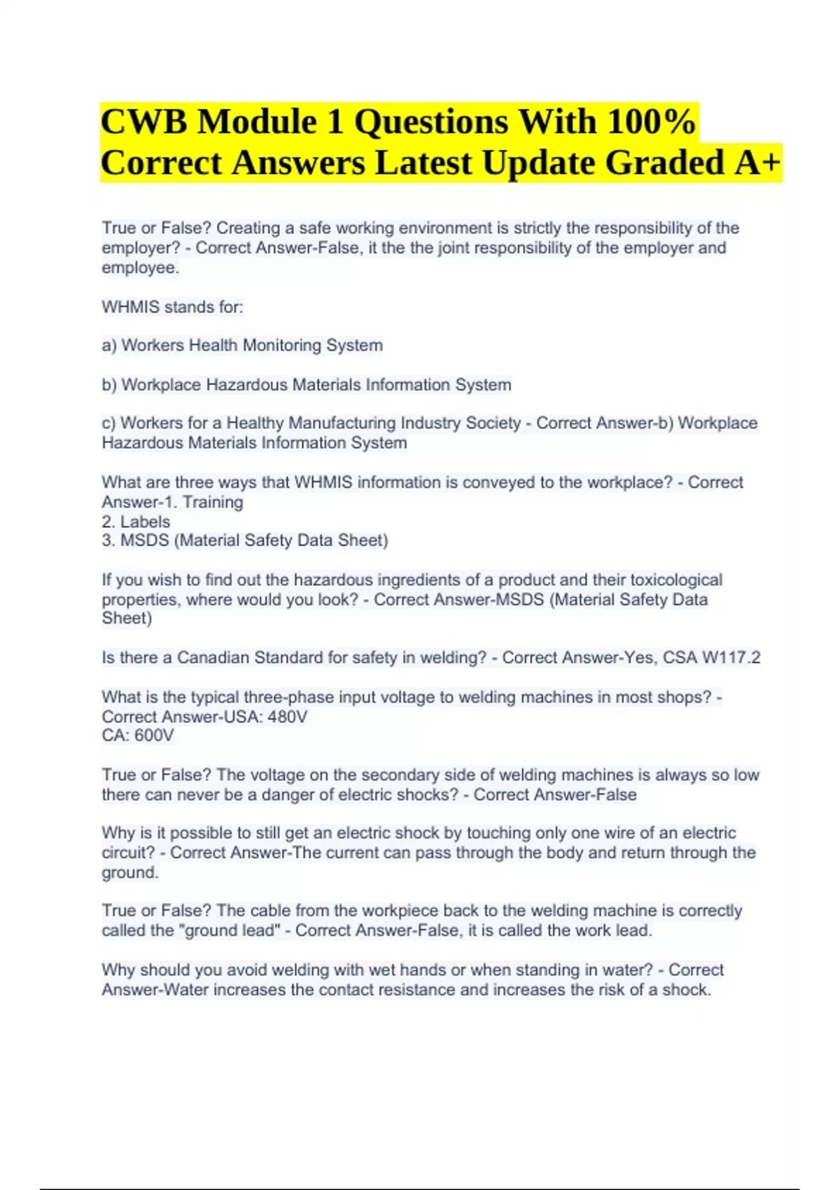 CWB Module 1 Questions With 100% Correct Answers Latest Update Graded A+. True or False? Creating a safe working environment is strictly the responsibility of the employer? - Correct Answer-False, it the the joint responsibility of the employer and employee. WHMIS stands for: a) Workers Health Monitoring System b) Workplace Hazardous Materials Information System c) Workers for a Healthy Manufacturing Industry Society - Correct Answer-b) Workplace Hazardous Materials Information System What are three ways that WHMIS information is conveyed to the workplace? - Correct Answer-1. Training 2. Labels 3. MSDS (Material Safety Data Sheet) If you wish to find out the hazardous ingredients of a product and their toxicological properties, where would you look? - Correct Answer-MSDS (Material Safety Data Sheet) Is there a Canadian Standard for safety in welding? - Correct Answer-Yes, CSA W117.2 What is the typical three-phase input voltage to welding machines in most shops? - Correct Answer-USA: 480V CA: 600V True or False? The voltage on the secondary side of welding machines is always so low there can never be a danger of electric shocks? - Correct Answer-False Why is it possible to still get an electric shock by touching only one wire of an electric circuit? - Correct Answer-The current can pass through the body and return through the ground. True or False? The cable from the workpiece back to the welding machine is correctly called the "ground lead" - Correct Answer-False, it is called the work lead. Why should you avoid welding with wet hands or when standing in water? - Correct Answer-Water increases the contact resistance and increases the risk of a shock. CWB Module 1 Questions With 100% Correct Answers Latest Update Graded A+ Of the two classes of radiation, which is the one that can damage living cells? Give two examples. - Correct Answer-Ionizing radiation. Examples: X-rays or Gamma-rays. Which of the following operations emits this type of radiation? a) shielded metal arc welding b) arc cutting c) radiography of welds d) resistance welding - Correct Answer-c) radiography of welds Is it true that you could suffer from "sunburn" on exposed skin by just being near a welding arc? - Correct Answer-Yes, true. What is the suggested shade number for a welder's helmet when using 5/32 in SMAW electrode at 150A? - Correct Answer-10 Which of the following situations is most likely to produce the greatest amount of direct and reflected ultraviolet light? a) resistance welding two thin steel sheets b) gas metal arc welding aluminium plate c) submerged arc welding - Correct Answer-b) gas metal arc welding aluminium plate True or False? Facepiece respirators with mechanical filters will remove all fumes and gases emitted in welding. - Correct Answer-False, Gases are not removed. Most fumes will be removed but not 100% Approximately how far could spatter travel when welding or cutting on structure about 2.5 m high? a) Possibly up to 6 m b) no more than 1 m c) up to 20 m - Correct Answer-a) Possibly up to 6 m What is the suggested shade number for a welder's helmet when using >1/4 in SMAW electrode at 500A? - Correct Answer-11 What is the suggested shade number for a welder's helmet when using 3 in SMAW electrode at 150A? - Correct Answer-8 What is the suggested shade number for a welder's helmet when using < 3/32 in SMAW electrode at 50A? - Correct Answer-7 What is the suggested shade number for a welder's helmet when using GMAW/FCAW/MCAW at 60-500A? - Correct Answer-10 What is the suggested shade number for a welder's helmet when using GMAW at <60 A? - Correct Answer-7 What is the suggested shade number for a welder's helmet when using GTAW at <50- 150 A? - Correct Answer-8 What is the suggested shade number for a welder's helmet when using GTAW at 150- 500 A? - Correct Answer-10 What is the suggested shade number for a welder's helmet when air carbon arc cutting light at <500 A? - Correct Answer-10 What is the suggested shade number for a welder's helmet when air carbon arc cutting heavy at 500 - 1000 A? - Correct Answer-11 What is the suggested shade number for a welder's helmet when plasma arc cutting and gouging very light at 20 A? - Correct Answer-5 What is the suggested shade number for a welder's helmet when plasma arc cutting and gouging light at 20 - 100 A? - Correct Answer-8 What is the suggested shade number for a welder's helmet when plasma arc cutting and gouging medium at 100 - 400 A? - Correct Answer-8 What is the suggested shade number for a welder's helmet when plasma arc cutting and gouging heavy at 400 - 800 A? - Correct Answer-10 What is the suggested shade number for a welder's helmet when oxygen cutting at plate thickness (light) of <25mm/ <1in? - Correct Answer-3 What is the suggested shade number for a welder's helmet when oxygen cutting at plate thickness (medium) of 25-100mm/ <1-6in? - Correct Answer-4 What is the suggested shade number for a welder's helmet when oxygen cutting at plate thickness (heavy) of >150mm/ >6in? - Correct Answer-5 For the SMAW process, which contributes more to the production of fume: base metal or electrode? - Correct Answer-electrode Some copper alloys contain a very toxic component. What is it? - Correct AnswerBeryllium Which of the following processes is likely to have the greatest fume generation rate? a) SMAW b) SAW c) FCAW - Correct Answer-c) FCAW Industrial hygienists often refer to allowable exposure to fumes in terms of the TLVTWA. What do the letters TWA stand for and what do they mean? - Correct AnswerTime Weighted Average. Average concentration over 8 hour day / 40 hour work week. True or False? The TLV for welding fume is 5mg/m3. It does not matter what is in the fume as long as the concentration is below this level. - Correct Answer-False. The components, either individually or as a group, could exceed their TLV levels even though the total fume level is below 5mg/m3. What label/class? Materials such as carbon dioxide and argon that are 