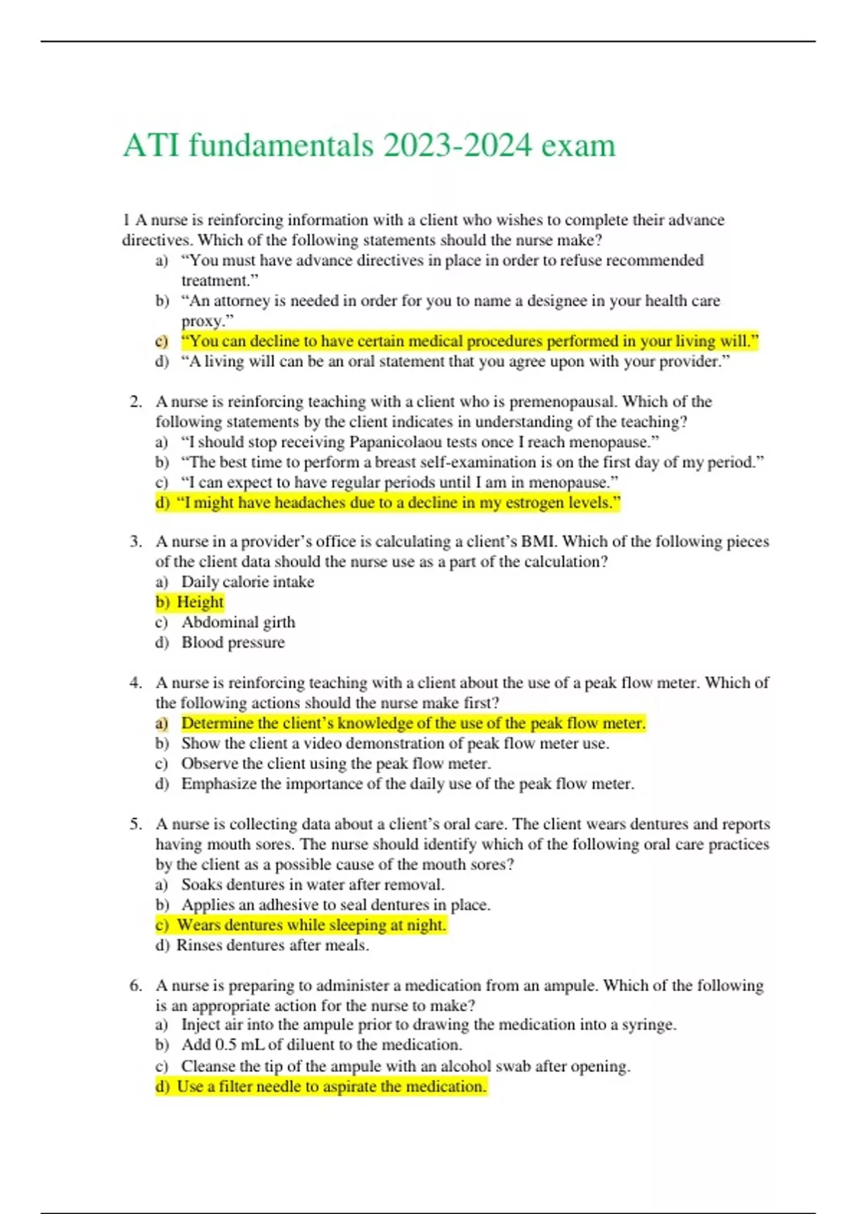 ATI fundamentals exam A nurse is reinforcing information with a client who wishes to complete their advance directives. Which of the following statements should the nurse make? a) “You must have advance directives in place in order to refuse recommended treatment.” b) “An attorney is needed in order for you to name a designee in your health care proxy.” c) “You can decline to have certain medical procedures performed in your living will.” d) “A living will can be an oral statement that you agree upon with your provider.” 2. A nurse is reinforcing teaching with a client who is premenopausal. Which of the following statements by the client indicates in understanding of the teaching? a) “I should stop receiving Papanicolaou tests once I reach menopause.” b) “The best time to perform a breast self-examination is on the first day of my period.” c) “I can expect to have regular periods until I am in menopause.” d) “I might have headaches due to a decline in my estrogen levels.” 3. A nurse in a provider’s office is calculating a client’s BMI. Which of the following pieces of the client data should the nurse use as a part of the calculation? a) Daily calorie intake b) Height c) Abdominal girth d) Blood pressure 4. A nurse is reinforcing teaching with a client about the use of a peak flow meter. Which of the following actions should the nurse make first? a) Determine the client’s knowledge of the use of the peak flow meter. b) Show the client a video demonstration of peak flow meter use. c) Observe the client using the peak flow meter. d) Emphasize the importance of the daily use of the peak flow meter.