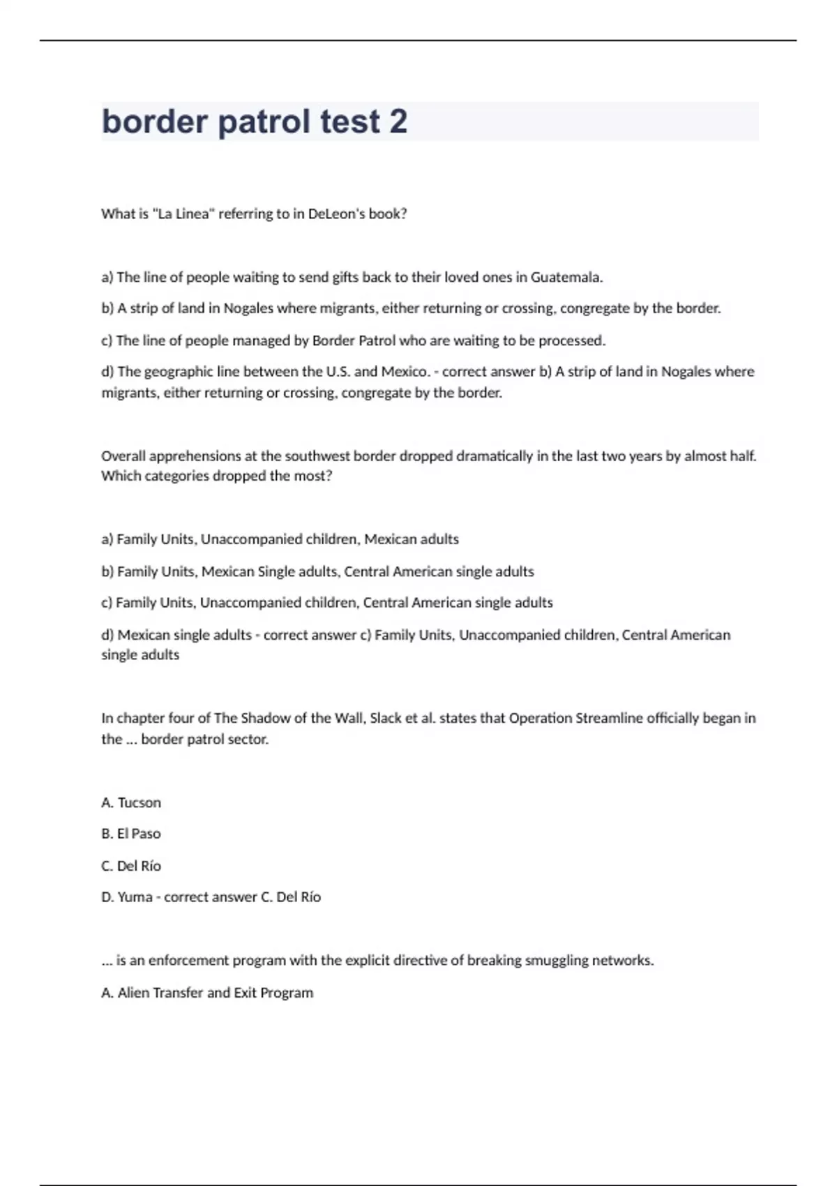 border patrol test 2 Question and answers 100% correct 2023/2024 What is "La Linea" referring to in DeLeon's book? a) The line of people waiting to send gifts back to their loved ones in Guatemala. b) A strip of land in Nogales where migrants, either returning or crossing, congregate by the border. c) The line of people managed by Border Patrol who are waiting to be processed. d) The geographic line between the U.S. and Mexico. - correct answer b) A strip of land in Nogales where migrants, either returning or crossing, congregate by the border. Overall apprehensions at the southwest border dropped dramatically in the last two years by almost half. Which categories dropped the most? a) Family Units, Unaccompanied children, Mexican adults b) Family Units, Mexican Single adults, Central American single adults c) Family Units, Unaccompanied children, Central American single adults d) Mexican single adults - correct answer c) Family Units, Unaccompanied children, Central American single adults