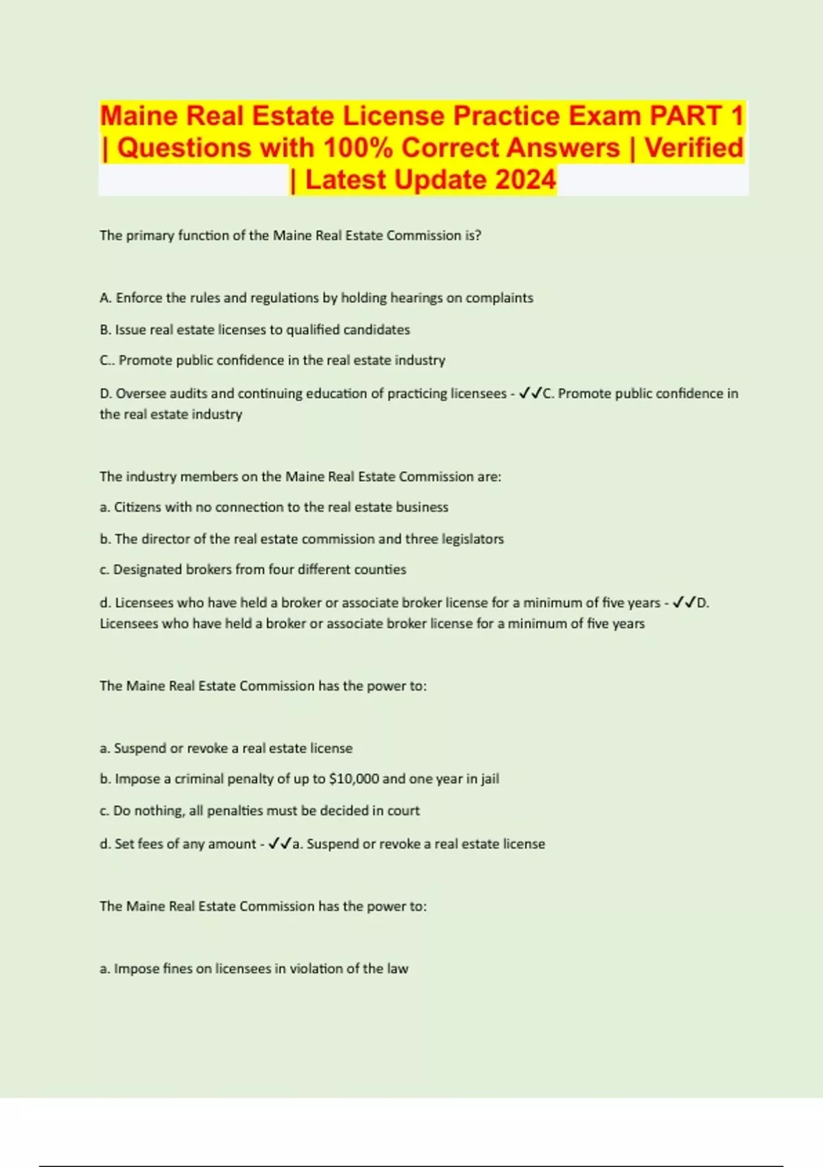 The primary function of the Maine Real Estate Commission is? A. Enforce the rules and regulations by holding hearings on complaints B. Issue real estate licenses to qualified candidates C.. Promote public confidence in the real estate industry D. Oversee audits and continuing education of practicing licensees - C. Promote public confidence in the real estate industry The industry members on the Maine Real Estate Commission are: a. Citizens with no connection to the real estate business b. The director of the real estate commission and three legislators c. Designated brokers from four different counties d. Licensees who have held a broker or associate broker license for a minimum of five years - D. Licensees who have held a broker or associate broker license for a minimum of five years The Maine Real Estate Commission has the power to: a. Suspend or revoke a real estate license b. Impose a criminal penalty of up to $10,000 and one year in jail c. Do nothing, all penalties must be decided in court d. Set fees of any amount - a. Suspend or revoke a real estate license The Maine Real Estate Commission has the power to: a. Impose fines on licensees in violation of the law
