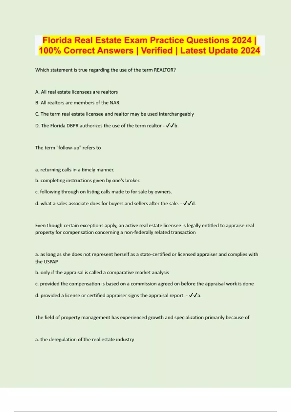 Florida Real Estate Exam Practice Questions 2024 | 100% Correct Answers | Verified | Latest Update 2024