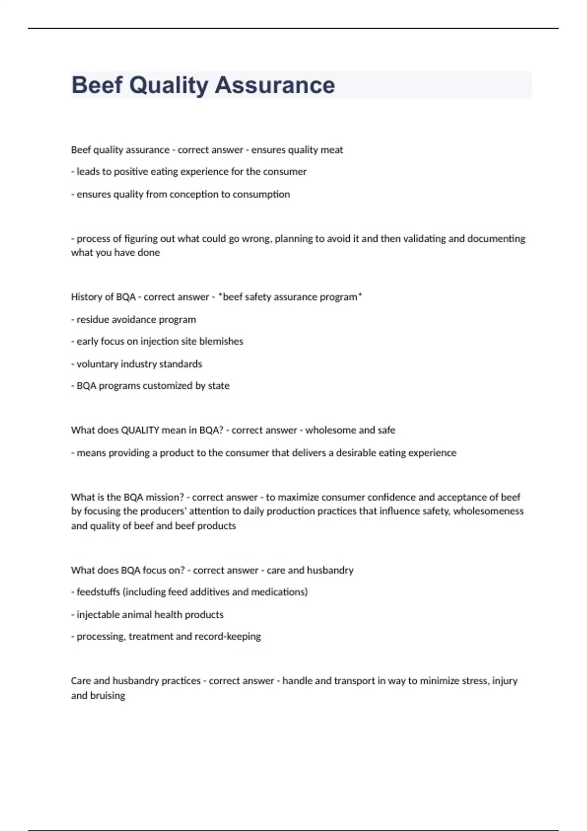 Beef Quality Assurance Questions with complete solution 2023/2024 Beef quality assurance - correct answer - ensures quality meat - leads to positive eating experience for the consumer - ensures quality from conception to consumption - process of figuring out what could go wrong, planning to avoid it and then validating and documenting what you have done History of BQA - correct answer - *beef safety assurance program* - residue avoidance program - early focus on injection site blemishes - voluntary industry