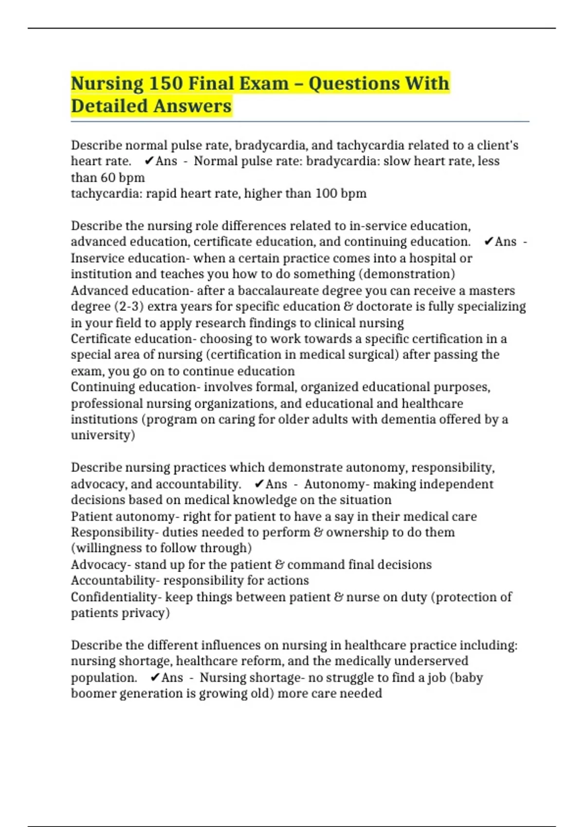 Nursing 150 Final Exam – Questions With Detailed Answers