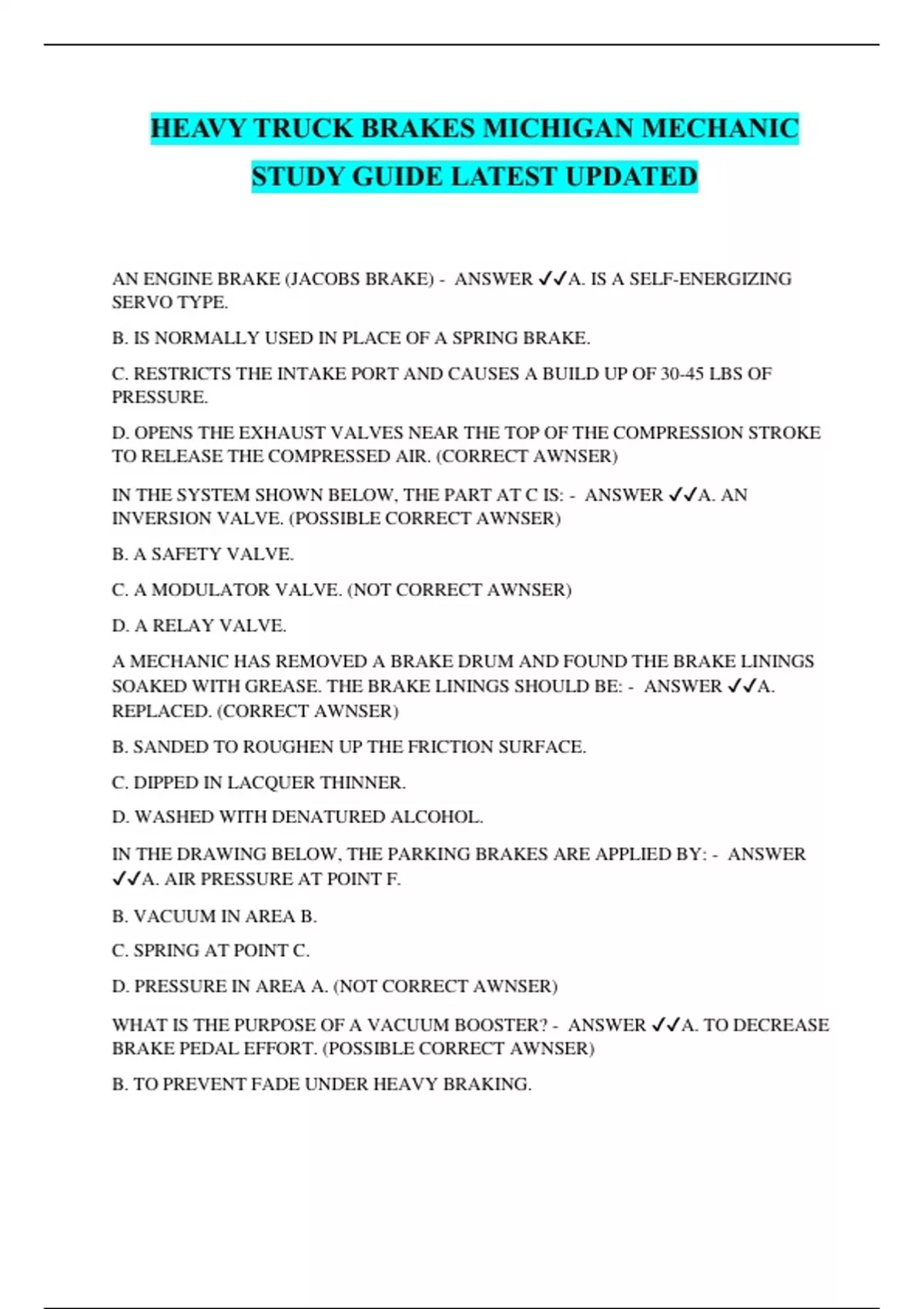 HEAVY TRUCK BRAKES MICHIGAN MECHANIC STUDY GUIDE LATEST UPDATED AN ENGINE BRAKE (JACOBS BRAKE) - ANSWER ️️ A. IS A SELF-ENERGIZING SERVO TYPE. B. IS NORMALLY USED IN PLACE OF A SPRING BRAKE. C. RESTRICTS THE INTAKE PORT AND CAUSES A BUILD UP OF 30-45 LBS OF PRESSURE. D. OPENS THE EXHAUST VALVES NEAR THE TOP OF THE COMPRESSION STROKE TO RELEASE THE COMPRESSED AIR. (CORRECT AWNSER) IN THE SYSTEM SHOWN BELOW, THE PART AT C IS: - ANSWER ️️ A. AN INVERSION VALVE. (POSSIBLE CORRECT AWNSER) B. A SAFETY VALVE. C. A MODULATOR VALVE. (NOT CORRECT AWNSER) D. A RELAY VALVE. A MECHANIC HAS REMOVED A BRAKE DRUM AND FOUND THE BRAKE LININGS SOAKED WITH GREASE. THE BRAKE LININGS SHOULD BE: - ANSWER ️️ A. REPLACED. (CORRECT AWNSER) B. SANDED TO ROUGHEN UP THE FRICTION SURFACE. C. DIPPED IN LACQUER THINNER. D. WASHED WITH DENATURED ALCOHOL. IN THE DRAWING BELOW, THE PARKING BRAKES ARE APPLIED BY: - ANSWER ️️ A. AIR PRESSURE AT POINT F. B. VACUUM IN AREA B. C. SPRING AT POINT C. D. PRESSURE IN AREA A. (NOT CORRECT AWNSER) WHAT IS THE PURPOSE OF A VACUUM BOOSTER? - ANSWER ️️ A. TO DECREASE BRAKE PEDAL EFFORT. (POSSIBLE CORRECT AWNSER) B. TO PREVENT FADE UNDER HEAVY BRAKING