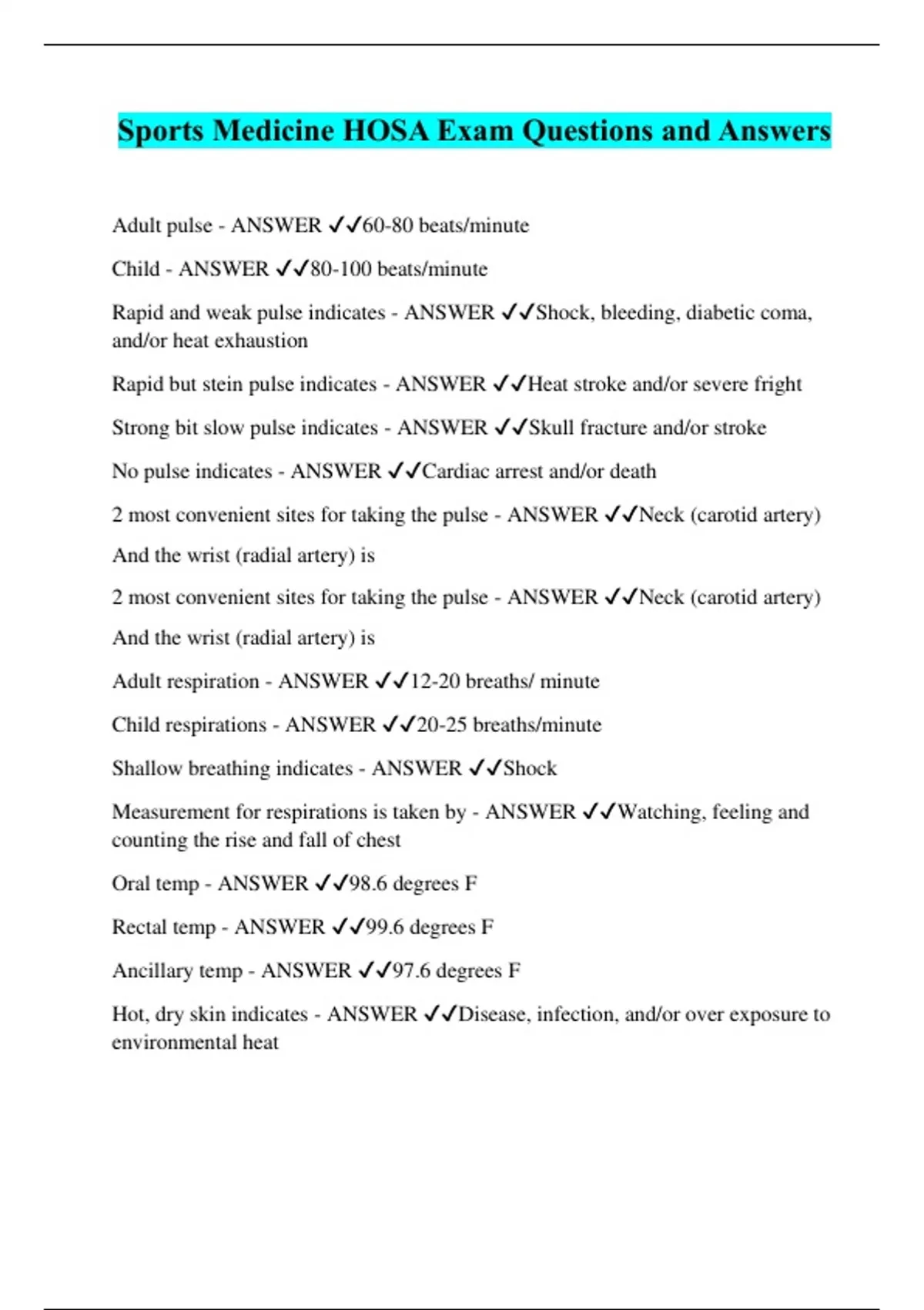 Sports Medicine HOSA Exam Questions and Answers Adult pulse - ANSWER ️️ 60-80 beats/minute Child - ANSWER ️️ 80-100 beats/minute Rapid and weak pulse indicates - ANSWER ️️ Shock, bleeding, diabetic coma, and/or heat exhaustion Rapid but stein pulse indicates - ANSWER ️️ Heat stroke and/or severe fright Strong bit slow pulse indicates - ANSWER ️️ Skull fracture and/or stroke No pulse indicates - ANSWER ️️ Cardiac arrest and/or death 2 most convenient sites for taking the pulse - ANSWER ️️ Neck (carotid artery) And the wrist (radial artery) is 2 most convenient sites for taking the pulse - ANSWER ️️ Neck (carotid artery) And the wrist (radial artery) is Adult respiration - ANSWER ️️ 12-20 breaths/ minute Child respirations - ANSWER ️️ 20-25 breaths/minute Shallow breathing indicates - ANSWER ️️ Shock Measurement for respirations is taken by - ANSWER ️️ Watching, feeling and counting the rise and fall of chest Oral temp - ANSWER ️️ 98.6 degrees F Rectal temp - ANSWER ️️ 99.6 degrees F Ancillary temp - ANSWER ️️ 97.6 degrees F Hot, dry skin indicates - ANSWER ️️ Disease, infection, and/or over exposure to environmental hea