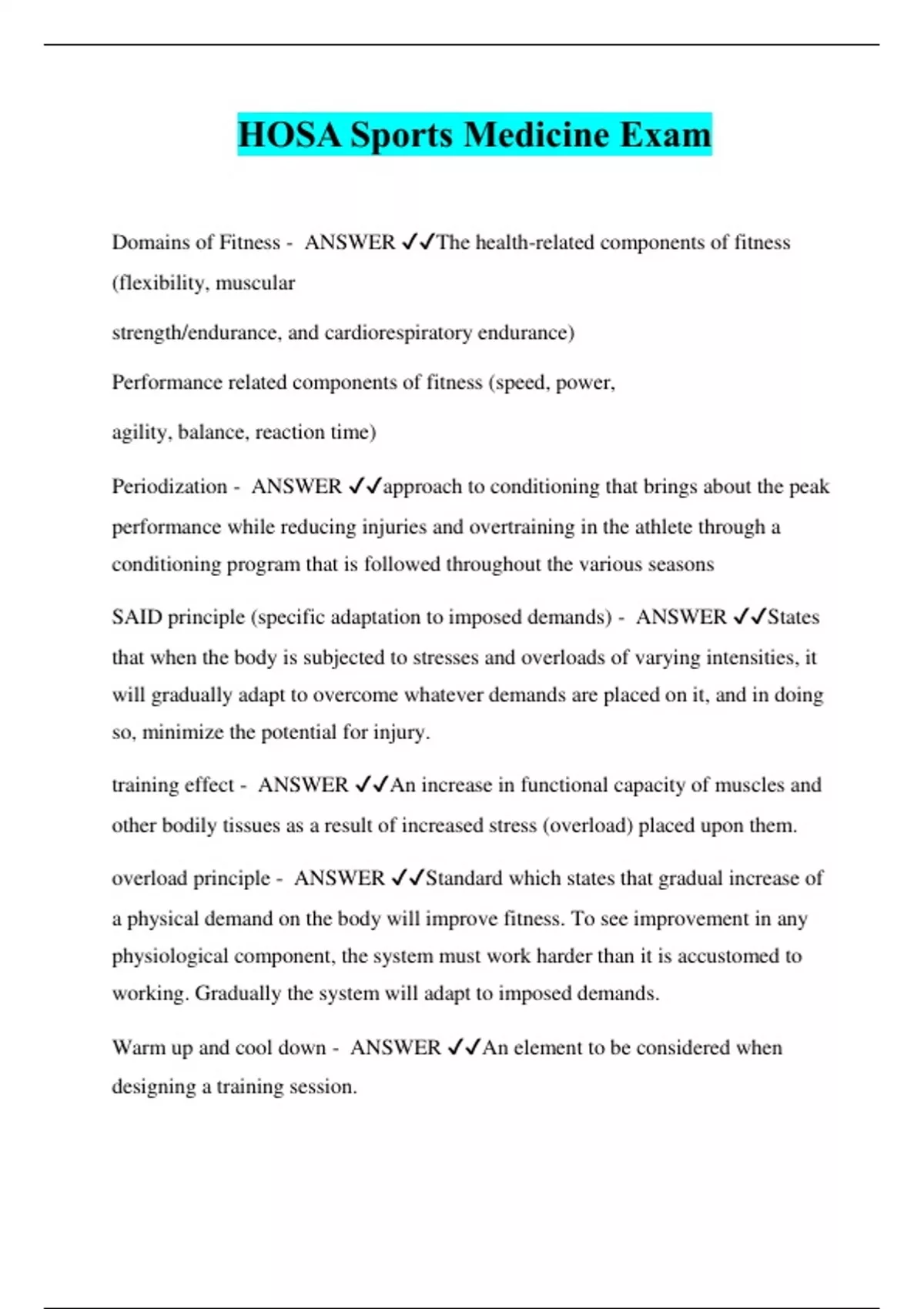HOSA Sports Medicine Exam Domains of Fitness - ANSWER ️️ The health-related components of fitness (flexibility, muscular strength/endurance, and cardiorespiratory endurance) Performance related components of fitness (speed, power, agility, balance, reaction time) Periodization - ANSWER ️️ approach to conditioning that brings about the peak performance while reducing injuries and overtraining in the athlete through a conditioning program that is followed throughout the various seasons SAID principle (specific adaptation to imposed demands) - ANSWER ️️ States that when the body is subjected to stresses and overloads of varying intensities, it will gradually adapt to overcome whatever demands are placed on it, and in doing so, minimize the potential for injury. training effect - ANSWER ️️ An increase in functional capacity of muscles and other bodily tissues as a result of increased stress (overload) placed upon them. overload principle - ANSWER ️️ Standard which states that gradual increase of a physical demand on the body will improve fitness. To see improvement in any physiological component, the system must work harder than it is accustomed to working. Gradually the system will adapt to imposed demands. Warm up and cool down - ANSWER ️️ An element to be considered when designing a training session.